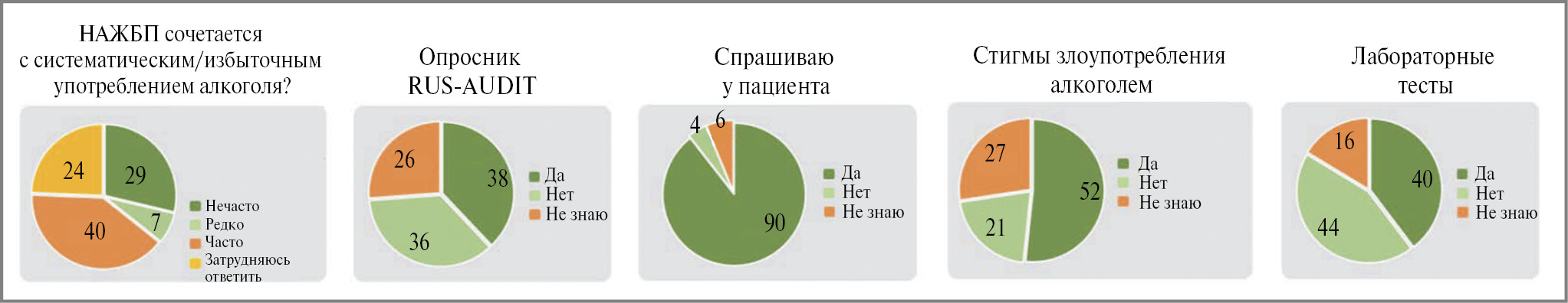 По данным результатов опроса специалистов первичной медико-санитарной помощи по вопросам диагностики и лечения НАЖБП, которые представила в своем докладе член-корреспондент РАН, профессор М.А. Ливзан, большинство (40%) врачей из различных регионов России сталкиваются с пациентами, имеющими сочетание НАЖБП и систематическое/избыточное употребление алкоголя в анамнезе. Необходимо отметить, что в анкетировании приняли участие 1172 медицинских работника (90,2% – женщины), среди них 58% – врачи-терапевты, в том числе врачи терапевты-участковые, 29% – фельдшеры, 13% – врачи общей практики (семейные врачи). В десятку наиболее активных вошли врачи-терапевты из Луганской Народной Республики (n=174 человека), Чувашской Республики (n=148), Нижегородской области (n=140), Забайкальского края (n=102), Республики Мордовии (n=73), Тульской области (n=66), Курской области (n=57), Курганской области (n=42), Донецкой Народной Республики (n=37) и Новосибирской области (n=35). Кроме того, 90% респондентов оценивают употребление алкоголя у пациентов, задавая соответствующий вопрос при сборе анамнеза, что существенно снижает достоверность. Лишь 38% специалистов используют в практике опросник RUS-AUDIT с целью определения уровня потребления алкоголя. Более 50% специалистов для дифференциальной диагностики АБП и НАЖБП оценивают у пациента стигмы злоупотребления алкоголем и лабораторные тесты. Диаграммы представлены на рис. 3.