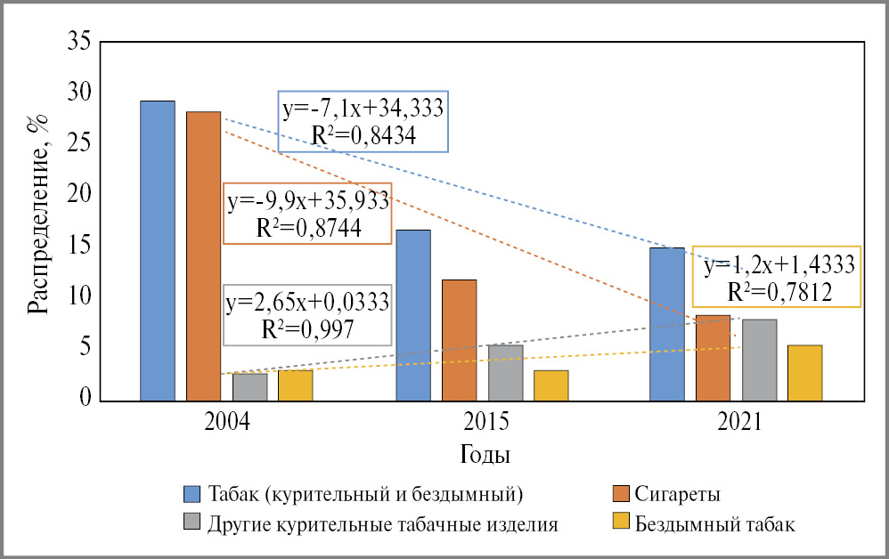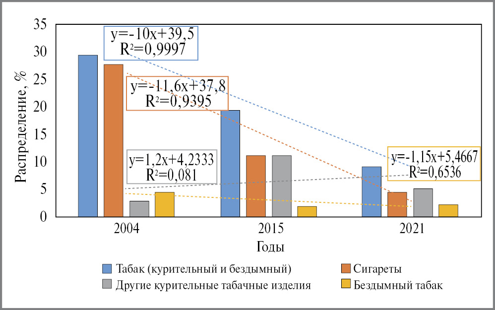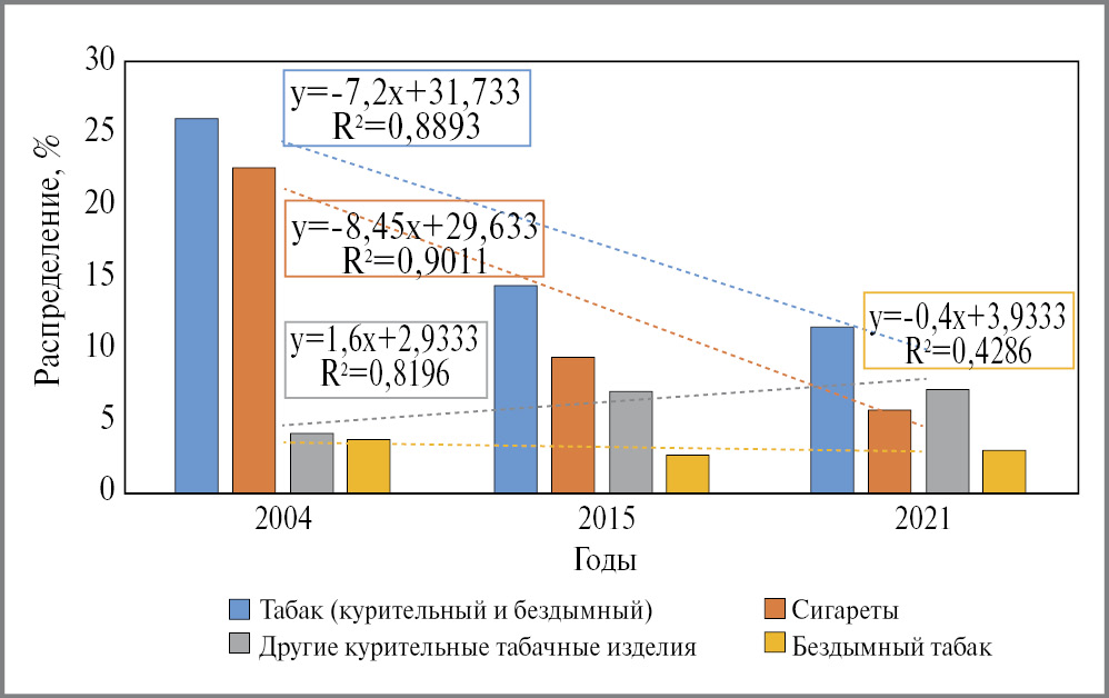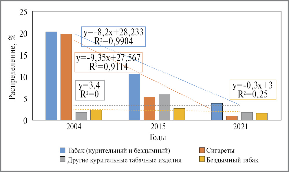 Как видно из рис. 5, в 2004–2021 гг. наблюдались устойчивые тренды снижения распространенности потребления курительного и/или бездымного табака (R2=0,9997), бездымного табака (R2=0,6536), курения сигарет (R2=0,9395). Тренд роста распространенности курения других табачных изделий являлся незначимым (R2=0,081).