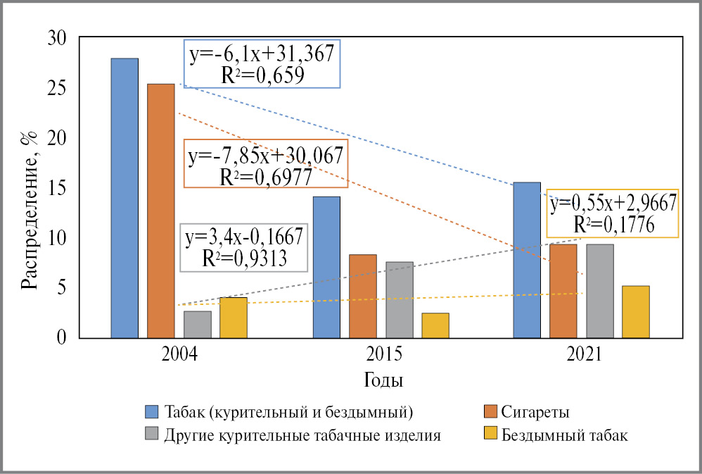 Как видно из рис. 1, в 2004–2021 гг. наблюдался устойчивый тренд снижения потребления табака (курительного и/или бездымного) с высокой достоверностью аппроксимации (R2=0,8434). Данное снижение в основном обусловлено существенным снижением распространенности курения сигарет (R2=0,8744). В то же время отмечен тренд увеличения распространенности потребления других курительных табачных изделий (R2=0,997) и бездымного табака (R2=0,7812).
