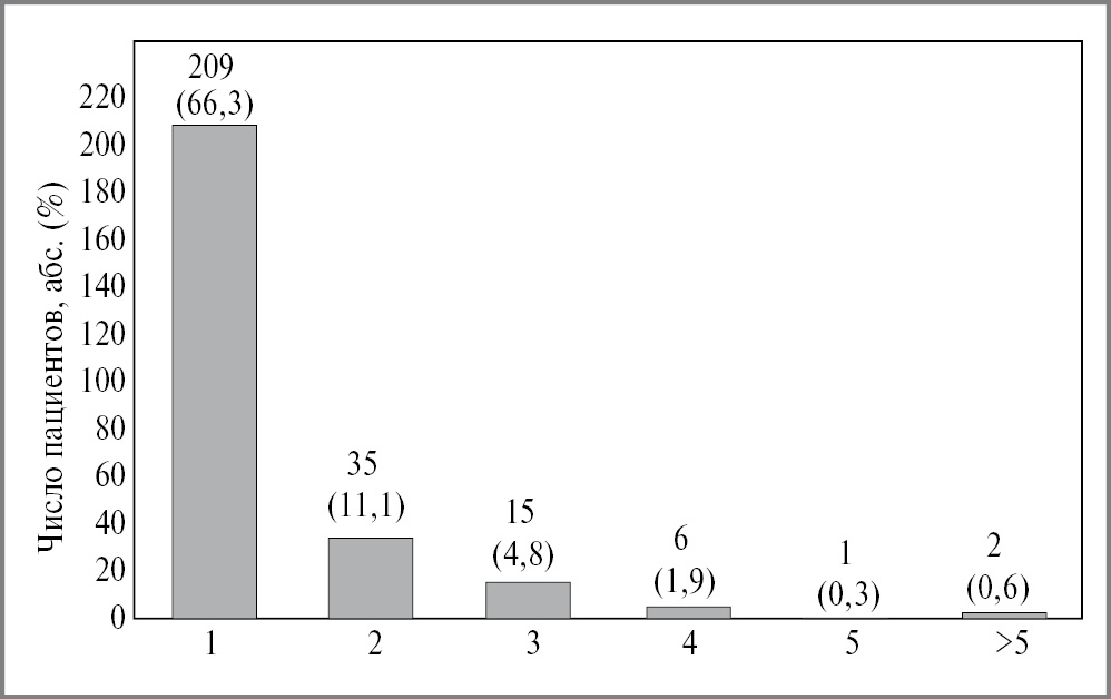У 268 (85,1%) пациентов зарегистрировано как минимум 1 обострение БА (рис. 2). Обострения чаще всего развивались весной (n=116; 36,8%), затем по убыванию частоты шли зима (n=91; 28,9%), лето (n=70; 22,2%) и осень (n=54; 17,1%). Средняя продолжительность обострения составляла 8,5 (5,3) дня. У большинства пациентов триггером обострения служили грипп или простудное заболевание (n=135; 46,2%).
