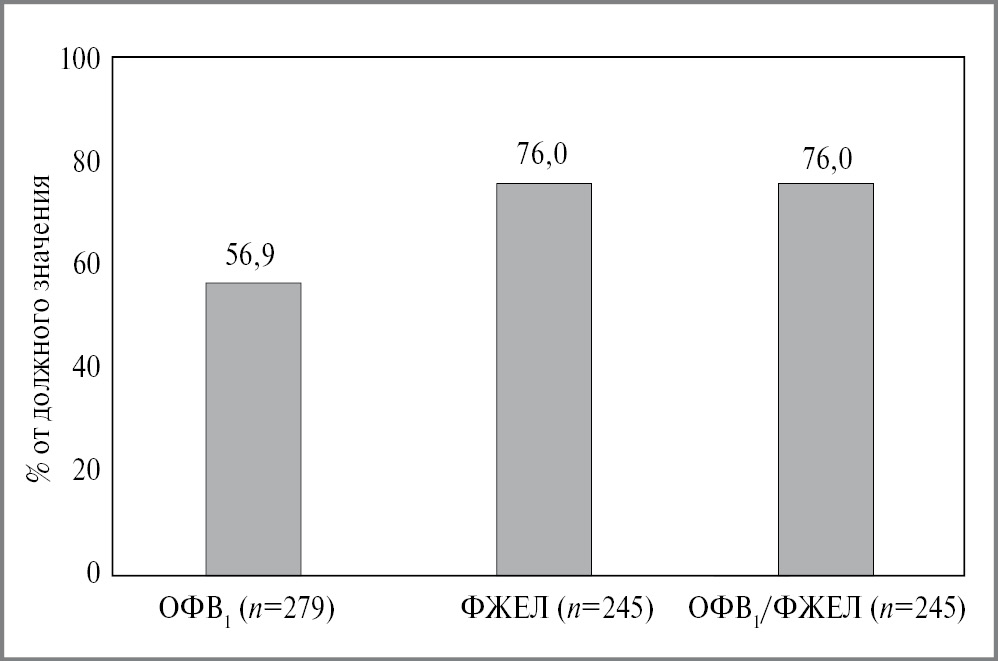 Данные спирометрии за предыдущие 12 мес зарегистрированы у 279 (88,6%) пациентов. У большинства из них (n=202; 72,4%) спирометрия проводилась однократно. Средние пребронходилатационные значения последних доступных показателей представлены на рис. 3.