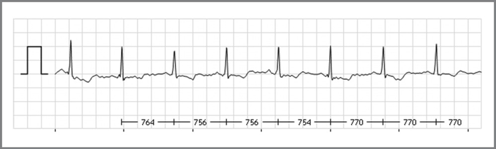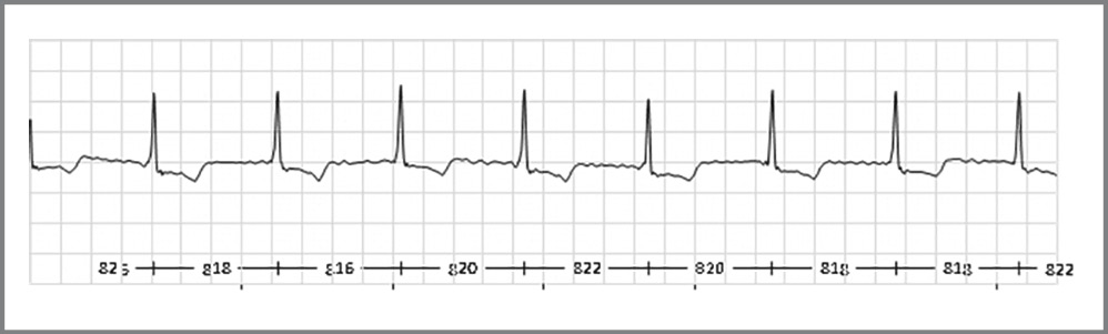 По данным ЭКГ с помощью одноканального монитора CardioQVARK (ООО «КардиоКВАРК», Россия) определялся синусовый ритм (СР) с ЧСС 75 уд/мин (рис. 1). На 12-канальной электрокардиограмме: СР с ЧСС – 78 уд/мин, признаки гипертрофии левого желудочка (ЛЖ). При проведении эхокардиографии (ЭхоКГ) выявлены признаки несимметричной концентрической гипертрофии миокарда ЛЖ с обструкцией выносящего тракта ЛЖ. Фракция выброса ЛЖ – 80%.