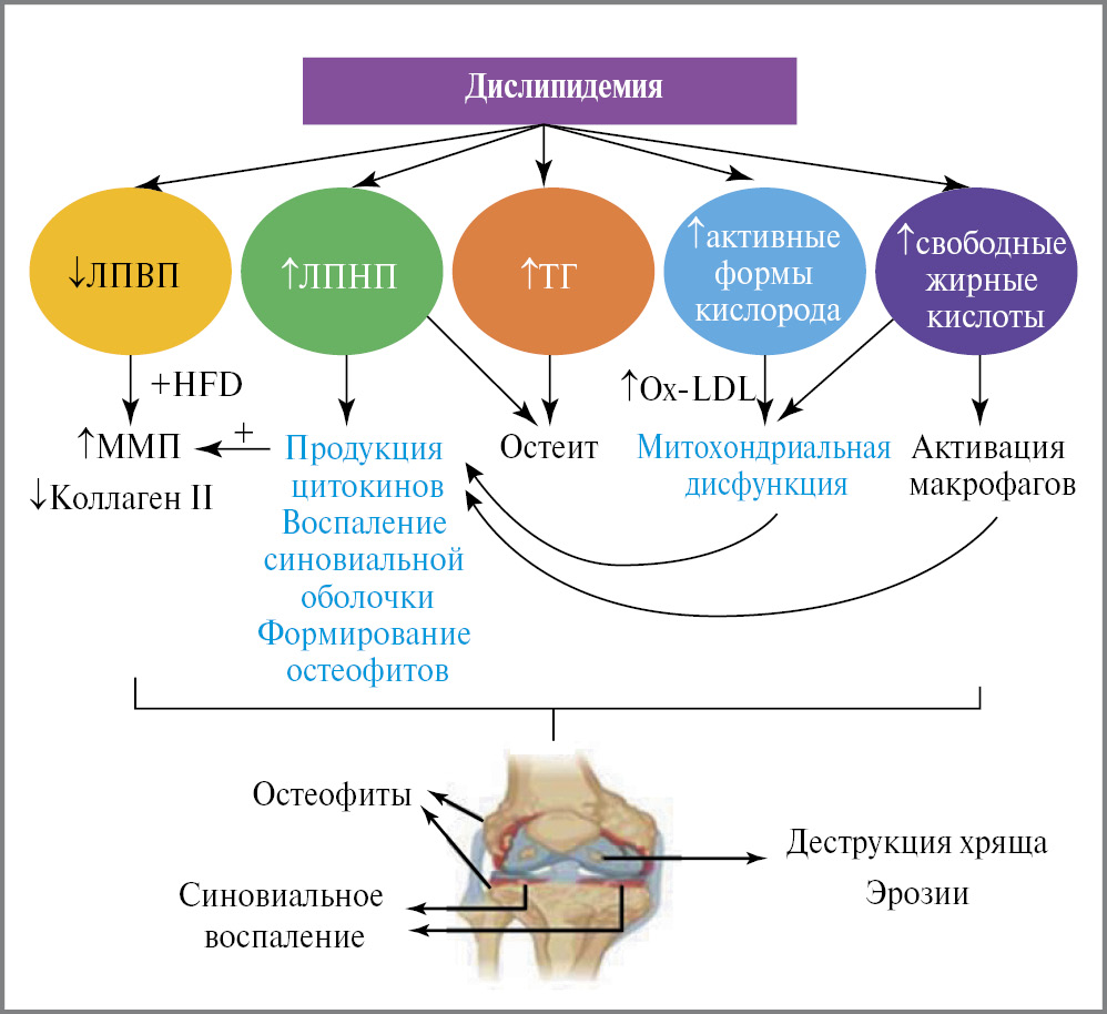 В литературе появляется все больше работ, свидетельствующих о том, что повышение ОХС, липопротеидов низкой плотности (ЛПНП) и триглицеридов (ТГ) в сыворотке крови ассоциировано не только с развитием ОА, но и с его прогрессированием (рис. 1) [10–12]. Согласно данным J. Xiong и соавт. [13], которые провели метаанализ (53 955 участников, включая 22 501 пациента с ОА, из них 19 733 лица с поражением суставов кистей, 2679 – коленных и 89 – тазобедренных суставов), наличие дислипидемии значительно увеличивало шанс развития заболевания (для исследований «случай-контроль»: ОШ 1,37, 95% ДИ 1,27–1,46; одномоментных: ОШ 1,33, 95% ДИ 1,21–1,46). В крупномасштабной работе корейских коллег (2021 г.) [14] продемонстрировано повышение вероятности симптоматического ОА при ГХС (ОШ 1,24, 95% ДИ 1,02–1,52; p=0,033). Однако в некоторых исследованиях не выявлены данные ассоциации [15–17]. В частности, Y. Xie и соавт. [18] анализировали взаимосвязь между метаболическим синдромом (МС) и его компонентами (ожирение, артериальная гипертензия – АГ, дислипидемия и гипергликемия) с ОА коленных суставов по материалам 40 статей. Результаты показали, что шанс рентгенологического ОА значимо повышается при МС, АГ и гипергликемии; симптоматического – при МС и АГ. Не установлено влияние дислипидемии на риски развития как рентгенологических, так и симптоматических признаков ОА (соответственно ОШ 1,22, 95% ДИ 0,97–1,53 и ОШ 1,05, 95% ДИ 0,96–1,15).