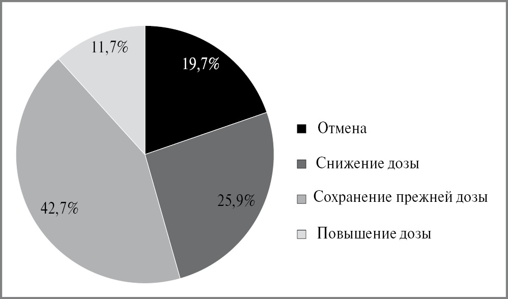 Через 6 мес после выписки полностью прекратить прием ГК удалось менее 1/5 пациентов. У большинства больных доза ГК осталась на прежнем уровне или повысилась (рис. 1).