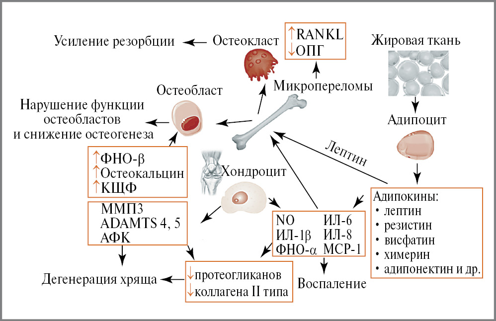 Рис. 1. Взаимодействие адипокинов, провоспалительных медиаторов и клеток суставных тканей в патогенезе остеоартрита при ожирении.