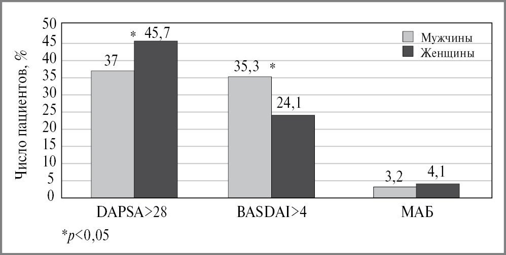 Рис. 1. Сравнение частоты высокой активности ПсА (DAPSA>28), спондилита (BASDAI>4) и МАБ у мужчин и женщин.