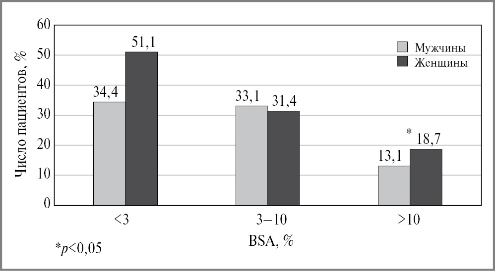 У 221 (34,4%) мужчины и 280 (51,1%) женщин (р=0,237) выявлен ограниченный Пс (BSA<3%), BSA от 3 до 10% встречалась у 136 (33,1%) мужчин и 171 (31,4%) женщин (р=0,575). Тяжелая форма Пс (BSA>10%) выявлена у 54 (13,1%) мужчин и 102 (18,7%) женщин (p=0,021; рис. 2).