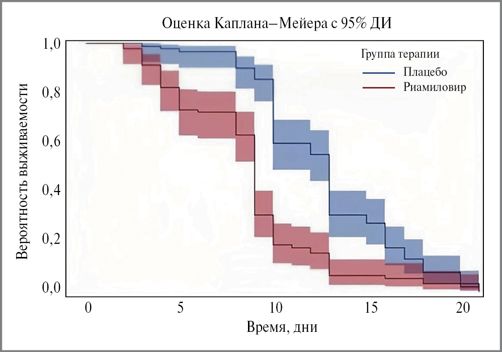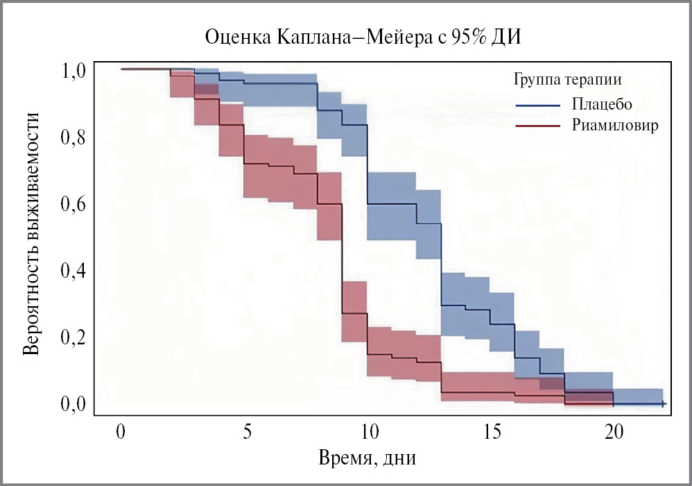 Оценка результатов проведена с использованием анализа выживаемости Каплана–Мейера, в котором в качестве события рассматривалось наступление стойкого улучшения всех оцениваемых КС/признаков COVID-19 с начала приема исследуемого препарата [время (дни)]. Вторичные конечные точки включали следующие показатели: