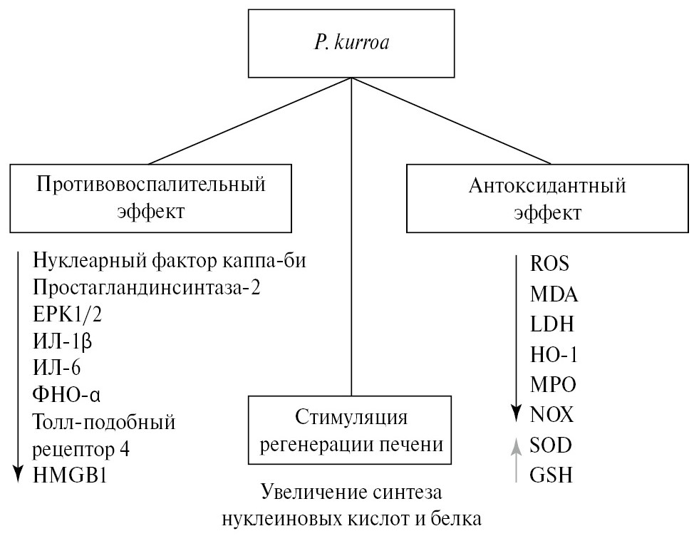 Таким образом, основные механизмы действия P. kurroa обеспечивают 3 основных аспекта эффективности: противовоспалительный, антиоксидантный и гепатопротекторный (рис. 1) [15].