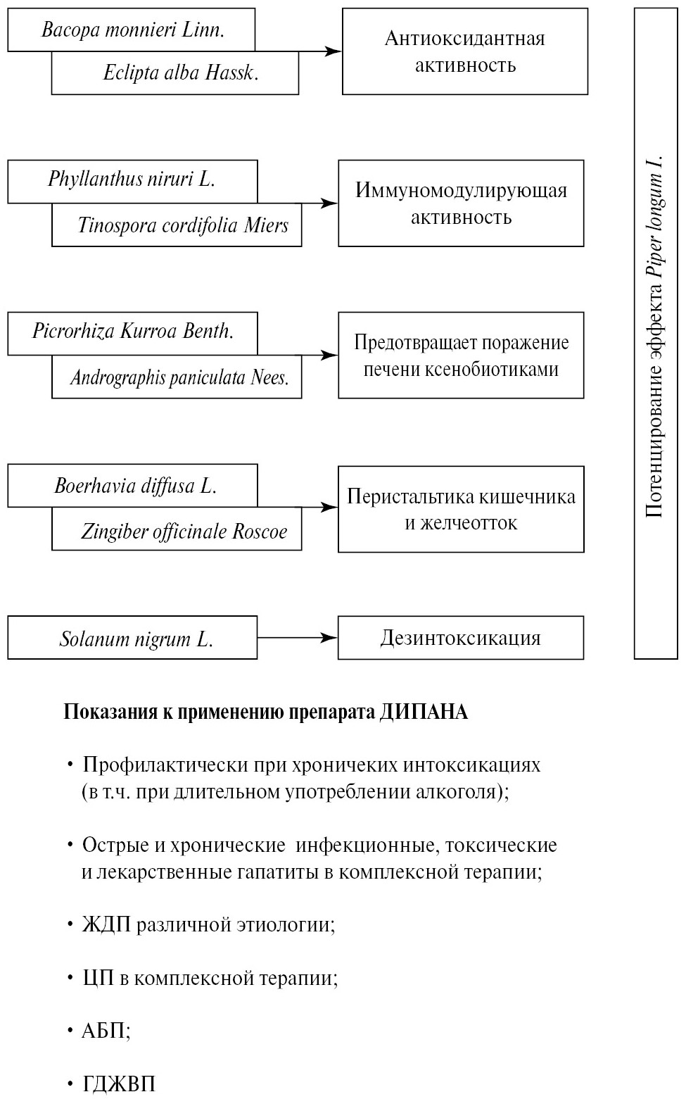 В состав ЛП ДИПАНА® входят сухие водные экстракты таких растений, как пикрориза курроа, андрографис метельчатый, маслен черный, филлантус нирури, тиноспора сердцелистная, иссоп водный, эклипта белая, берхавия раскидистая, имбирь лекарственный, перец длинный.
