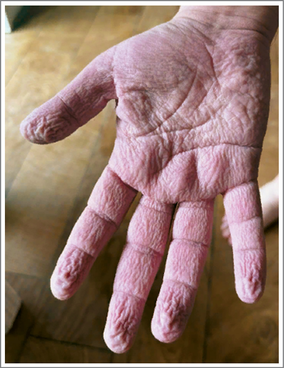 Пациент А. 25 лет обратился в связи с эпизодом незудящих сливных пигментированных пятен, гиперемией на коже груди длительностью до нескольких месяцев в сочетании с головными болями (рис. 1). Указанные жалобы отмечает с 22 лет, исключали аллергодерматозы. При биопсии кожи выявлен склероз дермы без воспалительных изменений, что расценено как локальная форма склеродермии. Признаков системного поражения в рамках склеродермии не выявляли – отсутствовали синдром Рейно, склеродактилия, капилляроскопия ногтевого ложа без отклонений. Показатели функции внешнего дыхания и диффузионной способности легких в норме, отсутствовали изменения в моче, креатинин – 96 мкмоль/л, не выявлено антител к центромерам топоизомеразы-1. В дальнейшем высыпания на коже полностью исчезли без остаточных рубцовых изменений, что позволяет окончательно отвергнуть диагноз склеродермии. Необычным свойством кожи у пациента являлось выраженная гидрофильность эпидермиса с его побелением и утолщением при кратковременном контакте кожи с водой (рис. 2), что указывало на резкое повышение способности эпидермиса к сорбции воды.