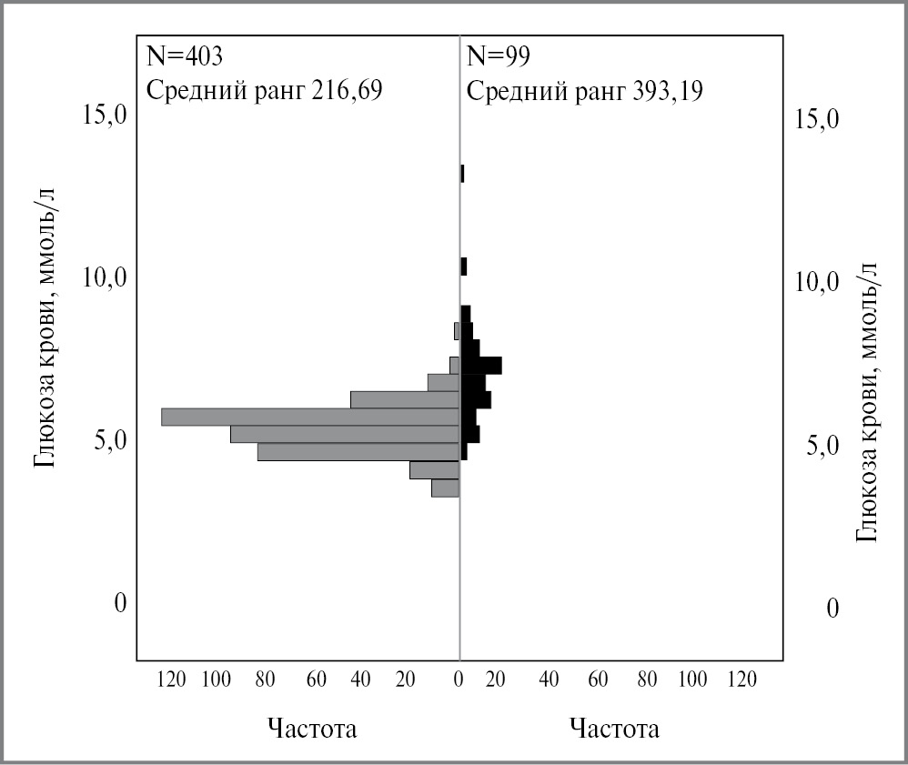 Рис. 2. Результаты измерения уровня глюкозы в крови натощак у пациентов с нормогликемией (слева), и у пациентов с нарушениями углеводного обмена (справа)