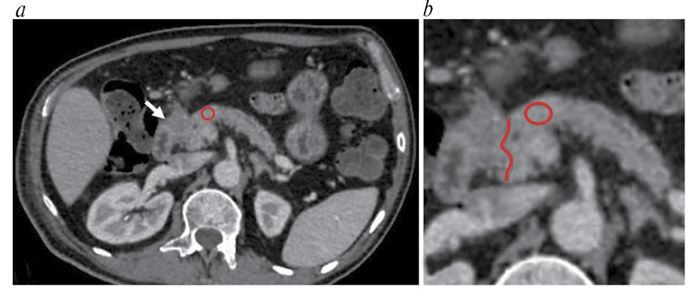 Fig. 1. An example of measuring the X-ray density of the pancreatic tissue near a neoplasm. MSCT in the pancreatic phase (PP): a – axial plane; b – zoomed fragment of the tomogram. The white arrow shows the pancreatic neoplasm, the red line shows the boundary of the neoplasm, and the red circle indicates the measurement zone.