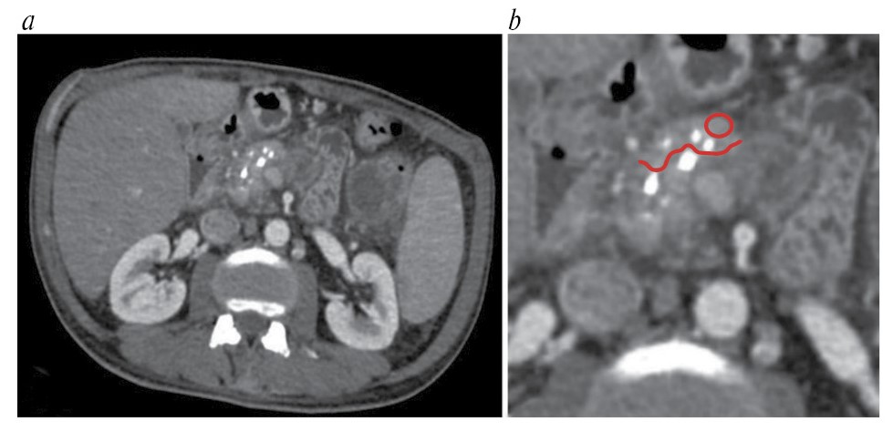 Fig. 2. An example of measuring the X-ray density of the pancreatic tissue in a patient with chronic pancreatitis (CP). MSCT in the PP: a – axial plane; b – zoomed fragment of the tomogram. The red line shows the planned margin of resection, and the red circle indicates the measurement zone.