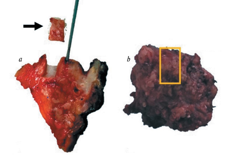 Рис. 3. Пример получения образца тканей из удаленного препарата с новообразованием ПЖ (а) и при резекционно-дренирующей операции по поводу ХП (b). Черной стрелкой и оранжевым контуром показаны изучаемые участки тканей.