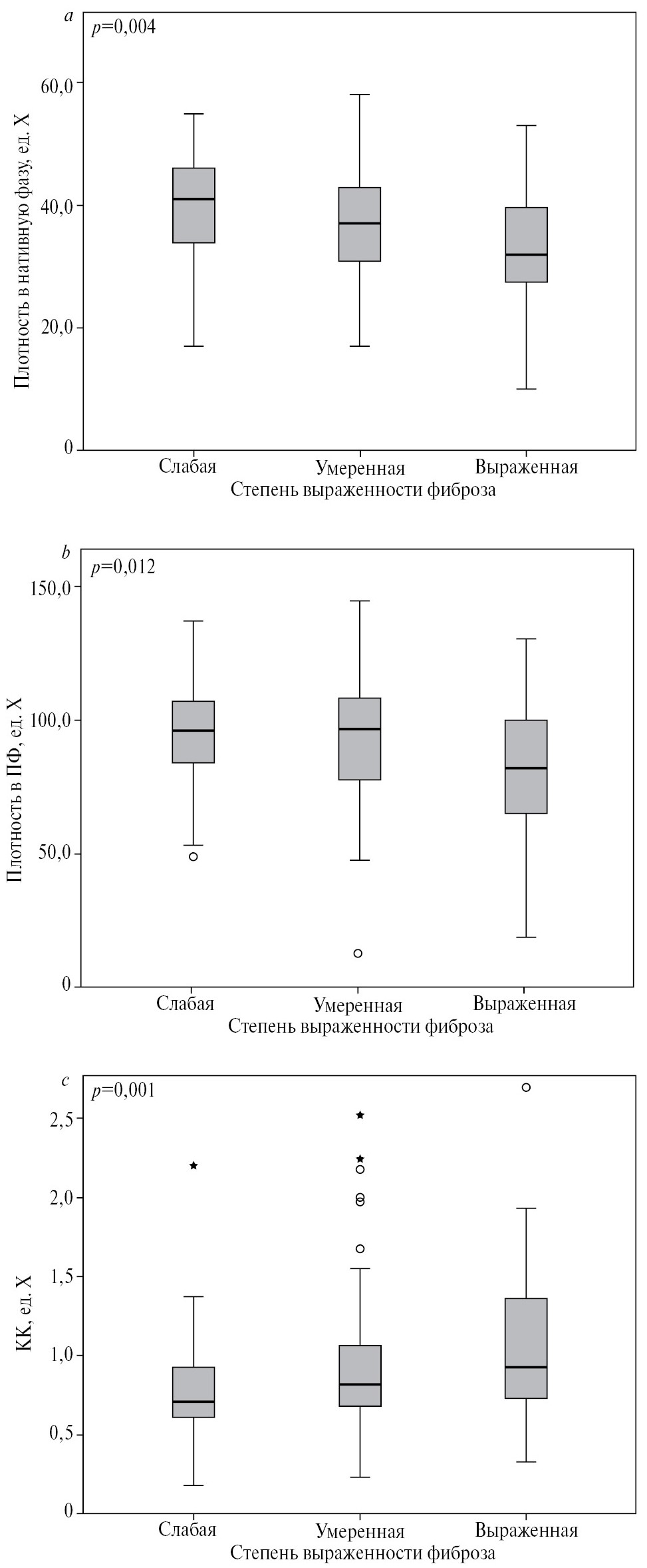 Статистическую обработку проводили при помощи Microsoft Office Excel 2013 и IBM SPSS Statistics 23.0. Для анализа распределения значений использовали тест Колмогорова–Смирнова. С целью определения достоверности и оценки значимости межгрупповых различий между значениями результатов постобработки данных МСКТ, разделенных согласно результатам патоморфологической оценки степени фиброза ПЖ, применяли непараметрические тесты для независимых выборок Манна–Уитни (при попарном анализе групп) и Краскела–Уоллиса (при сравнении значений более чем в двух группах). Парный корреляционный анализ проводили с вычислением коэффициента корреляции Спирмена (rho). ДИ составил 95%, различия считали статистически значимыми при p<0,05.