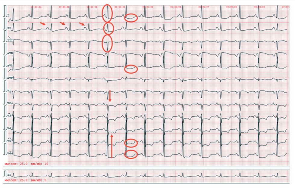 Рис. 1. Электрокардиограмма при поступлении. Изменение зубца Р по типу р-pulmonale (указано стрелками) и признаки гипертрофии ЛЖ: отклонение электрической оси сердца влево, дискордантное смещение сегмента ST в V5, V6, I, aVL (обведены), увеличение амплитуды зубца R в V5, V6, aVL и увеличение амплитуды зубца S в III, V1, V2 (указано стрелками).