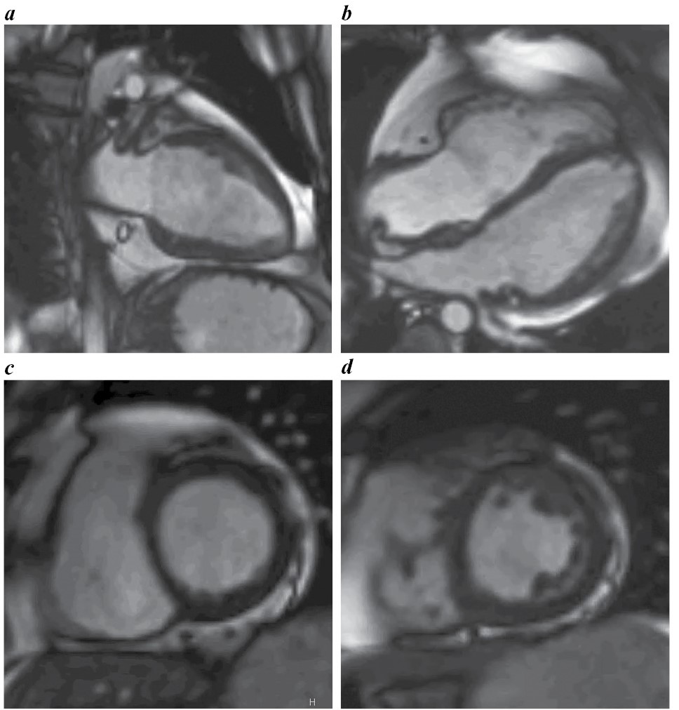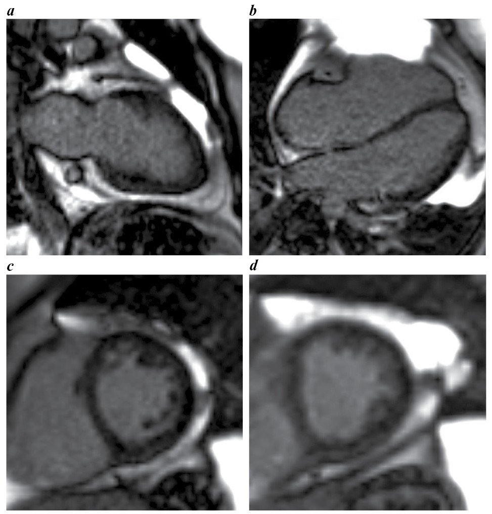 Рис. 3. МРТ сердца, кино-МРТ, фаза конечной диастолы: a – 2-камерная длинная ось ЛЖ; b – 4-камерная длинная ось ЛЖ; c, d – короткая ось ЛЖ через базальный и средний сегменты.