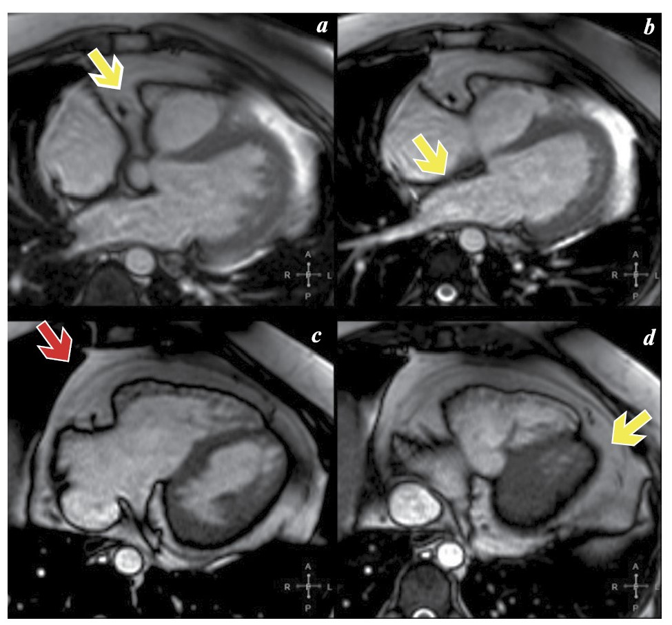 Выполнена магнитно-резонансная томография (МРТ) сердца с контрастированием (рис. 3, a–d), по данным которой очагового поражения миокарда желудочков воспалительного или ишемического характера, признаков отека миокарда и зон фиброза не выявлено. Не обнаружено расширения полостей ЛЖ и ПЖ (индексированный конечный диастолический объем ЛЖ – 60,4 мл/м2, индексированный конечный диастолический объем ПЖ – 47,9 мл/м2). Сократимость ПЖ оставалась в пределах нормы, ЛЖ незначительно снижена – до 54%. Толщина миокарда ЛЖ и ПЖ – в пределах нормы. Визуализировалась трабекулярность боковой стенки ЛЖ, не достигающая критериев некомпактного миокарда (рис. 4, a–d). В полости перикарда не выявлено жидкости, однако обращали внимание скопление эпикардиальной жировой ткани (более 200 г) на уровне атриовентрикулярных борозд, вдоль обоих желудочков, толщиной до 2,3–2,4 см (рис. 5, a–d), также липоматоз межпредсердной перегородки (рис. 5, b), скопление жировой ткани паракардиально (более 100 г).