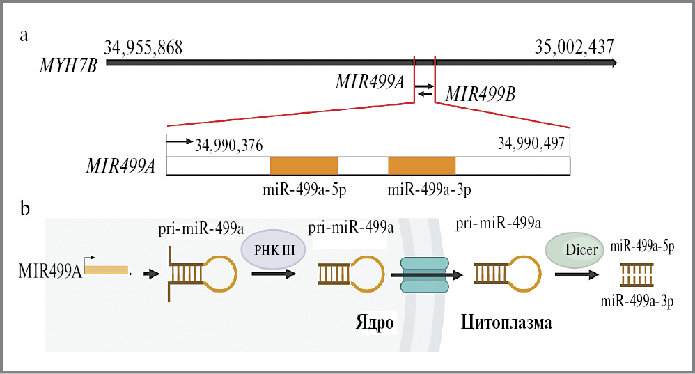Рис. 1. Хромосомная локализация гена MIR499A и биогенез кодируемой им микроРНК: a – гены MIR499A и MIR499B человека, кодирующие miR-499a и miR-499b, в составе гена-хозяина MYH7B. Оранжевым цветом обозначены участки, кодирующие зрелые -5p и -3p цепи miR-499a. Указаны геномные координаты генов MYH7B и MIR499A на хромосоме 20; стрелками обозначено направление транскрипции MIR499A и MIR499В; b – процесс созревания miR-499a-3p и miR-499a-5p из первичного транскрипта MIR499A в кардиомиоцитах. Пояснения см. в тексте.