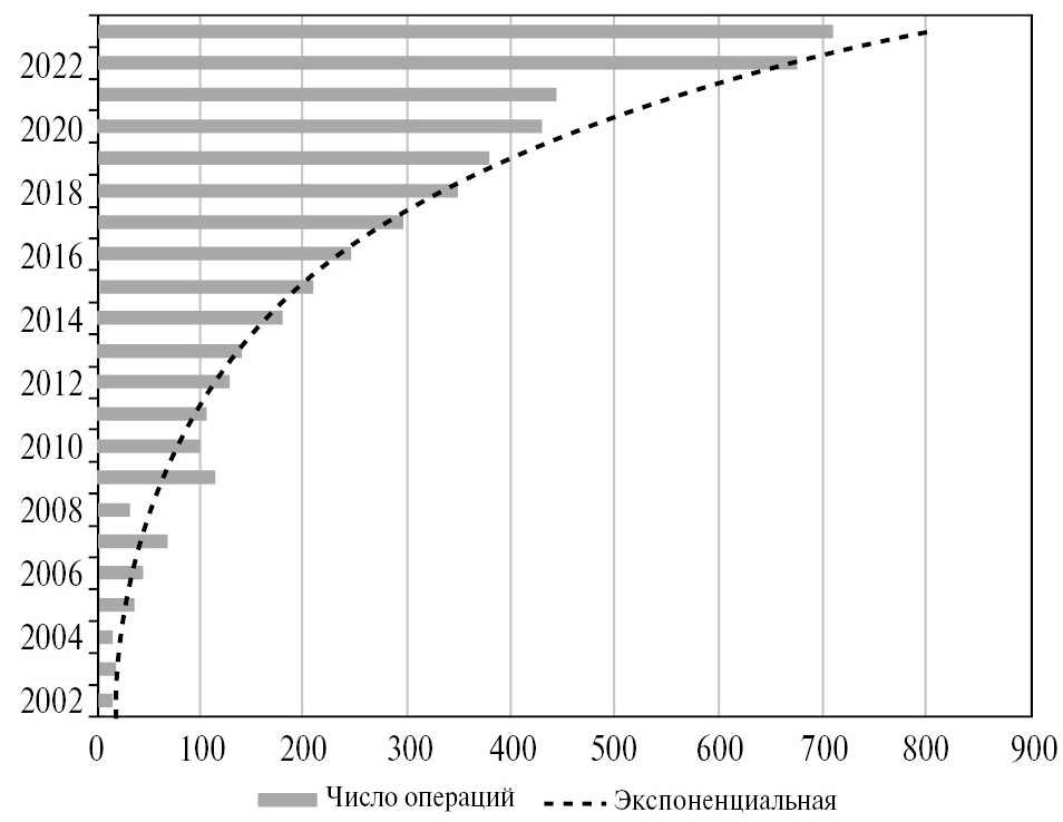Отсутствие систематической медицинской помощи пациентам с ПГПТ, ГипоПТ и другими минеральными нарушениями в России нередко приводило к несвоевременной диагностике заболеваний на поздних стадиях с уже сформировавшимися (в т.ч. необратимыми) тяжелыми осложнениями и, как следствие, к высокому риску инвалидизации и смертности среди этой категории пациентов. Активная деятельность коллектива ОПОЩЖ и НМО под руководством Н.Г. Мокрышевой позволила в значительной степени решить проблему. Достаточно отметить, что до 2011 г. в ГНЦ РФ ФГБУ «НМИЦ эндокринологии им. акад. И.И. Дедова» госпитализировались не более 100 пациентов с минеральными и костными нарушениями с целью диагностики, консервативного и хирургического лечения, а в 2017 г. только хирургические вмешательства проведены более чем 300 пациентам с заболеваниями ОЩЖ. Число госпитализированных пациентов с патологией кальций-фосфорного обмена в ГНЦ РФ ФГБУ «НМИЦ эндокринологии им. акад. И.И. Дедова» увеличивается с каждым годом и на сегодня составляет не менее 1 тыс. пациентов в год, а количество хирургических вмешательств по поводу патологии ОЩЖ превышает 600–700 в год (рис. 1), что сопоставимо с ведущими мировыми центрами. На графике виден экспоненциальный рост числа операций.