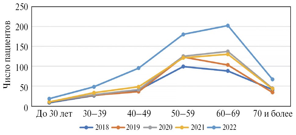 Кроме того, отмечается стойкая тенденция к увеличению количества хирургических вмешательств по поводу заболеваний ОЩЖ (преимущественно ПГПТ) у пациентов старшей возрастной группы (рис. 2 и 3).