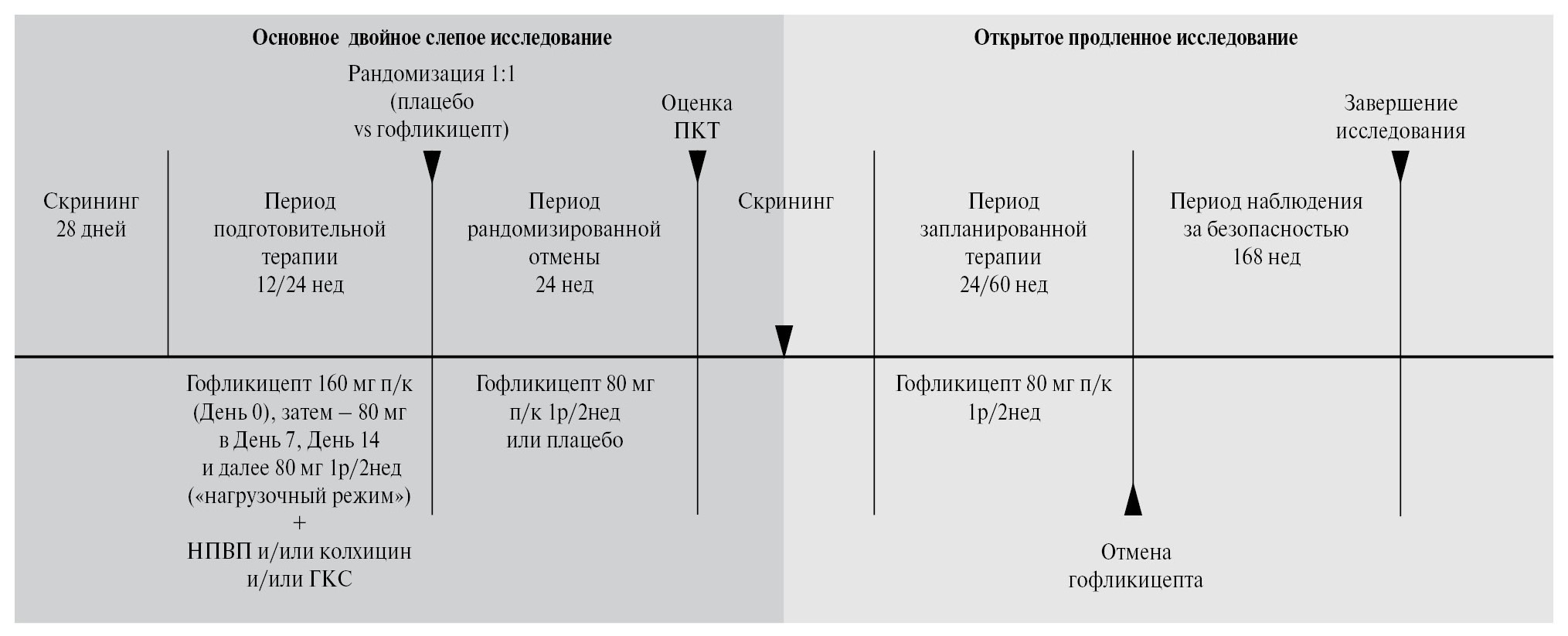 Примечание. ПКТ – первичная конечная точка исследования (время до рецидива перикардита в период рандомизированной отмены), нед – недель, п/к 1р/2нед – подкожно 1 раз в 2 недели.