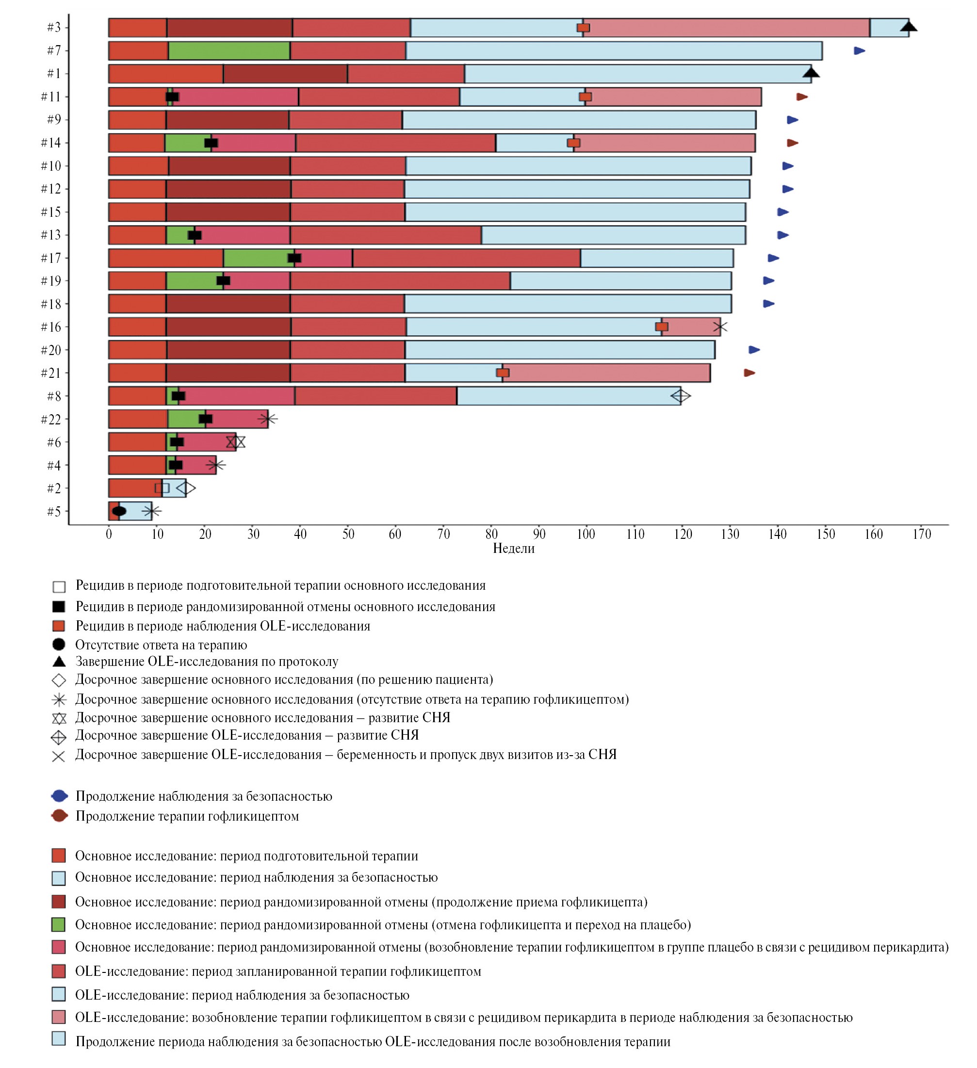 OLE-исследование включало период скрининга в течение одного дня через 2 нед после окончания периода рандомизированной отмены основного исследования. Продолжительность периода запланированной терапии гофликицептом составляла 24 нед для пациентов, сохранивших статус ремиссии в периоде рандомизированной отмены, или максимально 60 нед от момента рецидива перикардита у пациентов из группы плацебо, переведенных на терапию гофликицептом в периоде рандомизированной отмены основного исследования. Продолжительность периода наблюдения за безопасностью составляла 168 нед после завершения периода запланированной терапии, когда в случае возникновения рецидива перикардита было возможным возобновить терапию гофликицептом длительностью 60 нед (рис. 1).