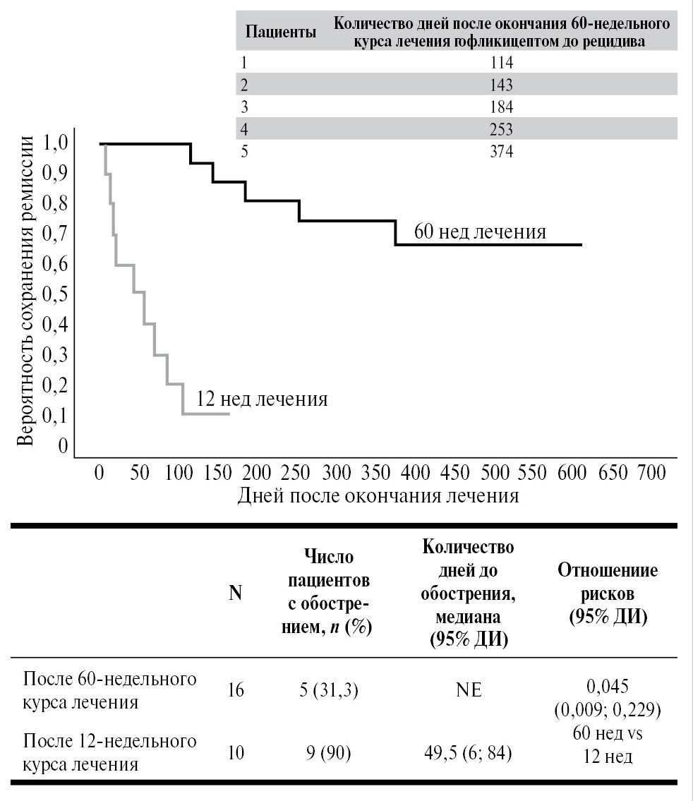 Медиана длительности участия пациентов в OLE-исследовании на момент среза данных составила 95,8 нед. После завершения 60 нед лечения гофликицептом и его отмены согласно протоколу частота рецидивов в OLE-исследовании составила 31,3% (n=5/16) по сравнению с частотой рецидивов 90% (n=9/10) после 12 нед лечения в основном исследовании (отношение рисков 0,045, p<0,001). Медиана времени [95% доверительный интервал – ДИ] до рецидива перикардита после 12 нед терапии гофликицептом в основном исследовании составила 49,5 дня [6, 0; 84, 0] [21]. После 60 нед лечения гофликицептом в OLE-исследовании не удалось рассчитать медиану времени до рецидива из-за малого количества рецидивов (минимальное время до рецидива составило 114 дней, максимальное – 374 дня); рис. 3.