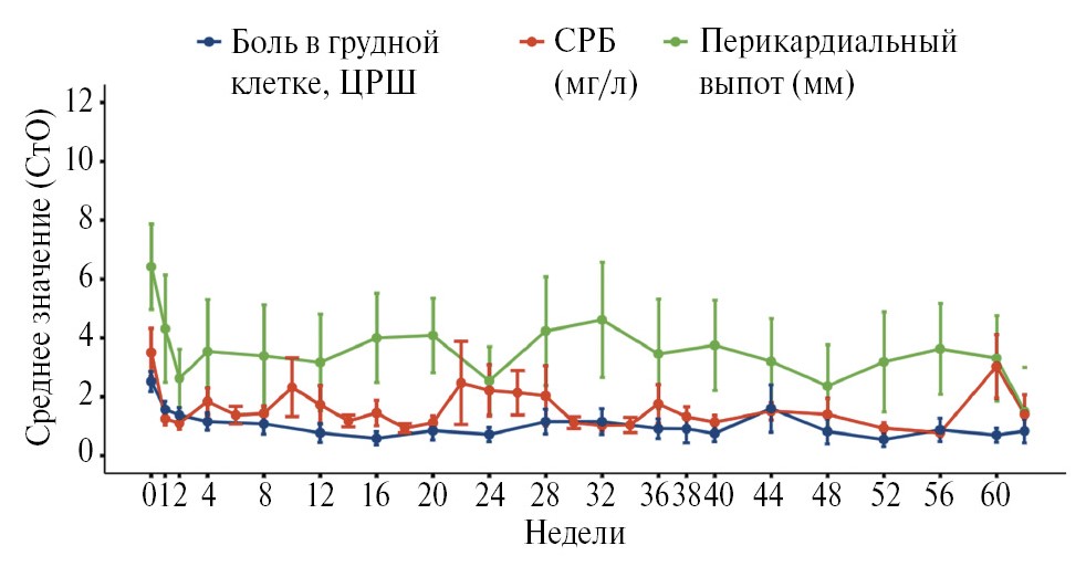 На протяжении длительной 60-недельной терапии гофликицептом отмечалась клинико-лабораторная ремиссия: рецидивов во время терапии не было, сохранялся нормальный средний уровень СРБ, низкие средние уровни интенсивности боли в грудной клетке и перикардиального выпота (рис. 4).