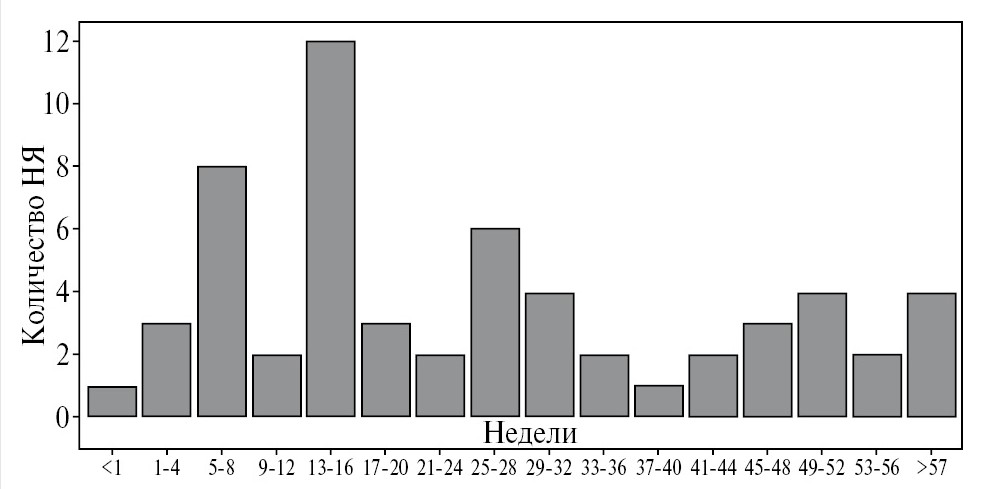 Следует отметить, что при анализе НЯ за период непрерывной 60-недельной терапии гофликицептом не отмечено нарастание числа НЯ с увеличением длительности терапии (рис. 5).