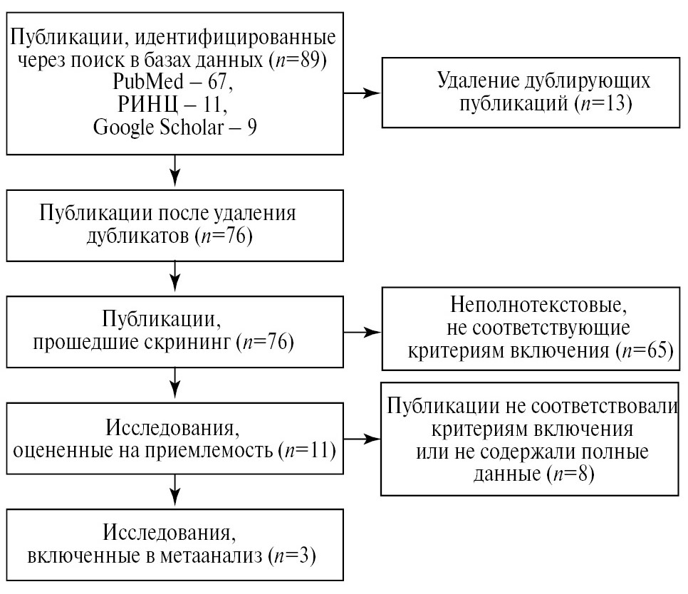 Всего выделено 89 публикаций, из которых удалено 13 дублирующих записей и еще 65 записей, не содержащих полнотекстовых статей и не соответствующих исследуемой тематике. Из 11 клинических исследований, подходящих под условия поиска, 8 публикаций не соответствовали критериям включения или не содержали полных данных. Таким образом, в анализ включено 3 исследования с общей выборкой в 1870 пациентов (рис. 1).