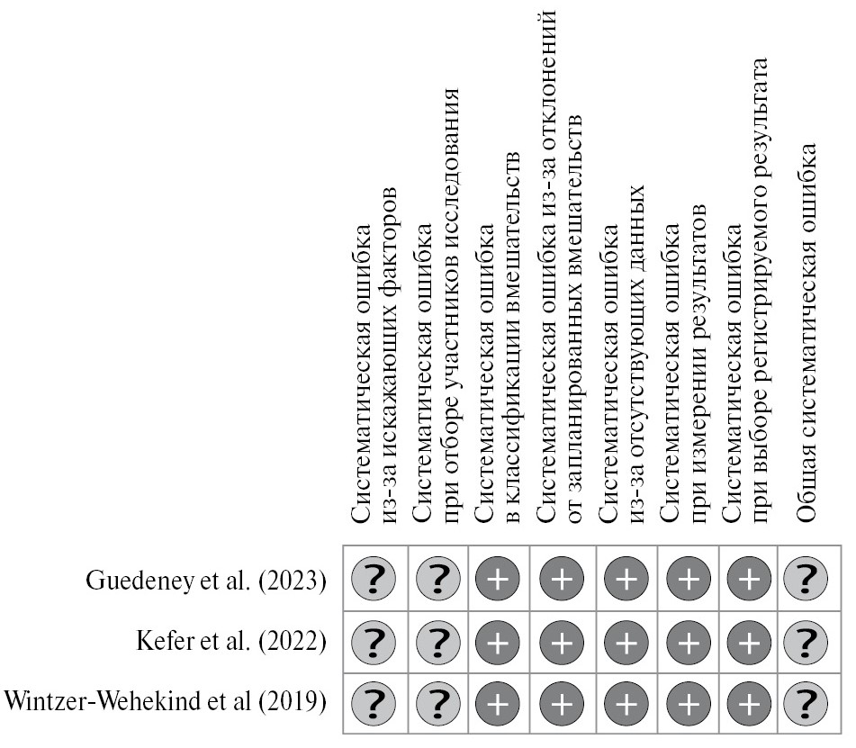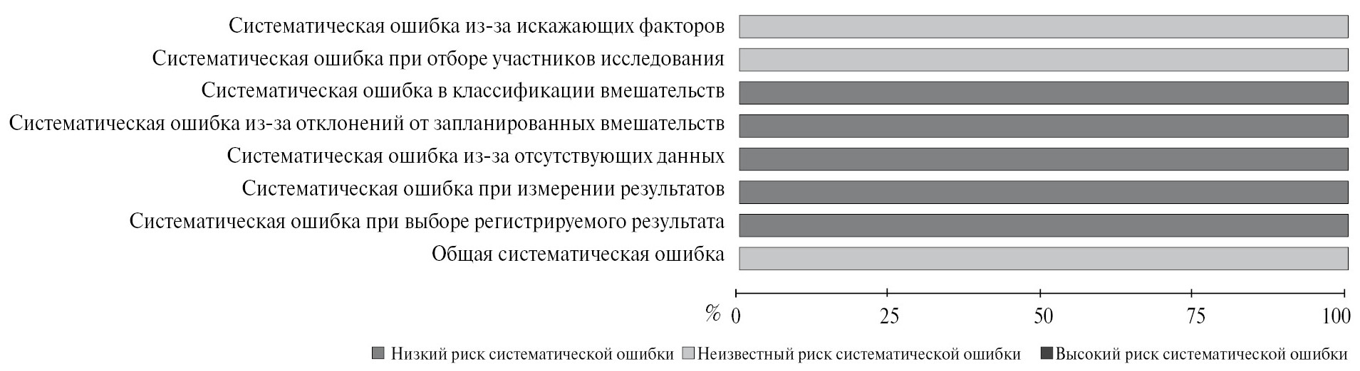 Для оценки качества включенных исследований применялись критерии ROBINS-I tool, позволяющие объективно изучить риск смещения в когортных исследованиях и исследованиях «случай-контроль», где интервенции не распределяются случайным образом. В качестве категорий использовались: смещение из-за конфаудинга (Bias due to confounding); смещение, связанное с отбором участников в исследование (Bias in selection of participants into the study); смещение вследствие классификации вмешательств (Bias in classification of interventions); смещение, связанное с отклонением от намеченного вмешательства (Bias due to deviations from intended interventions); смещение, связанное с отсутствием данных (Bias due to missing data); смещение, обусловленное измерением исходов (Bias in measurement of outcomes); смещение, связанное с представлением результатов (Bias in selection of the reported result). В каждой категории риск смещения классифицировался как низкий, неопределенный или высокий.