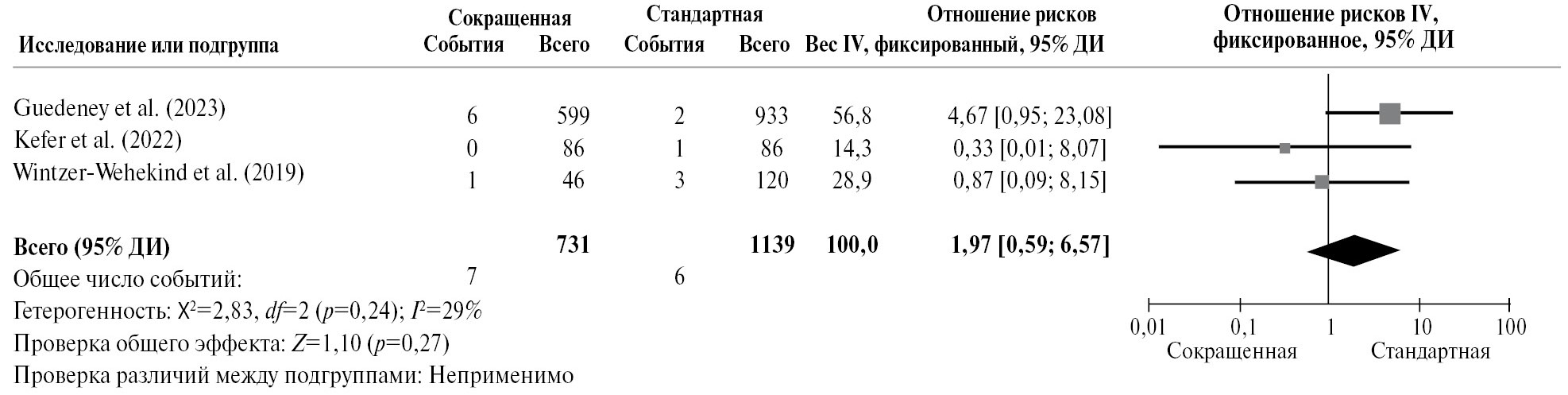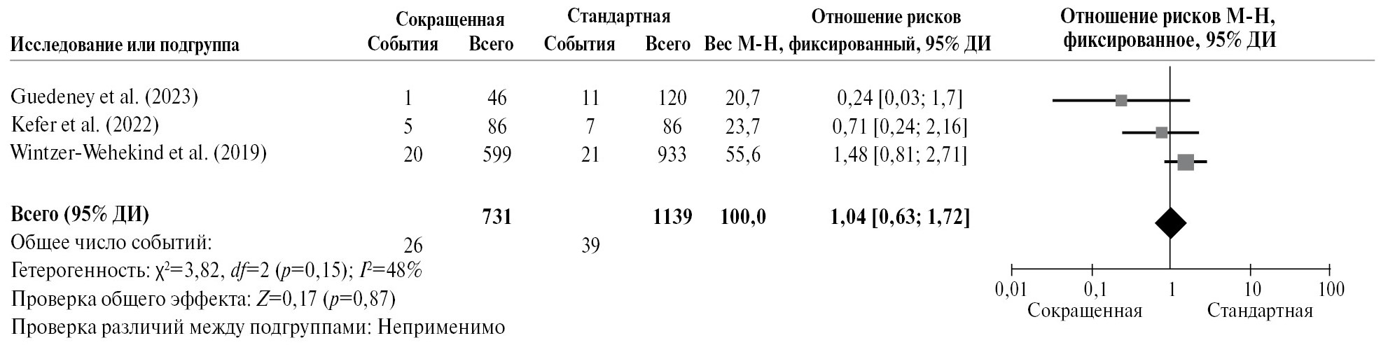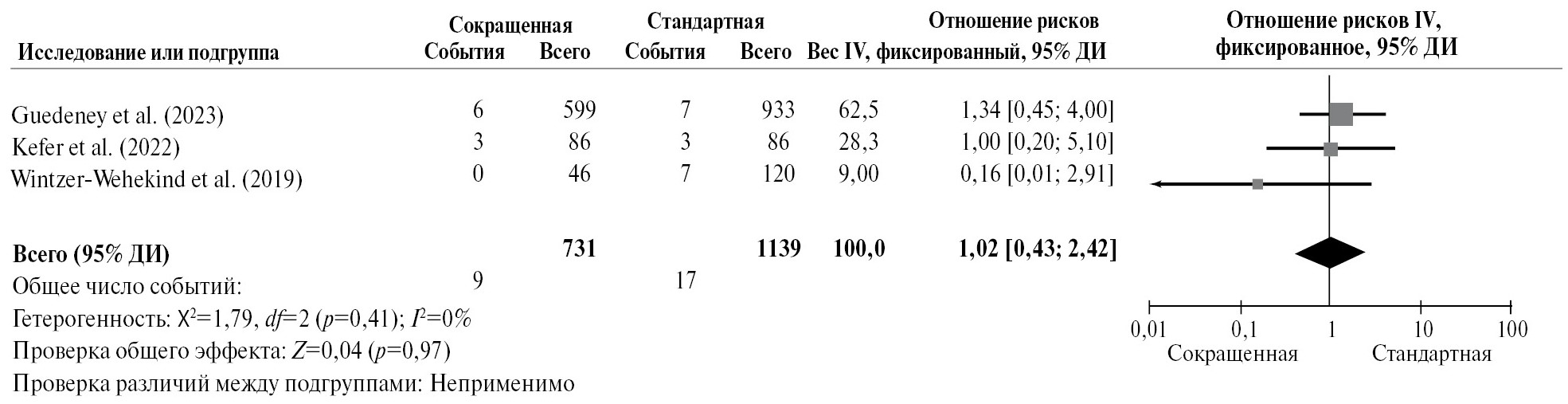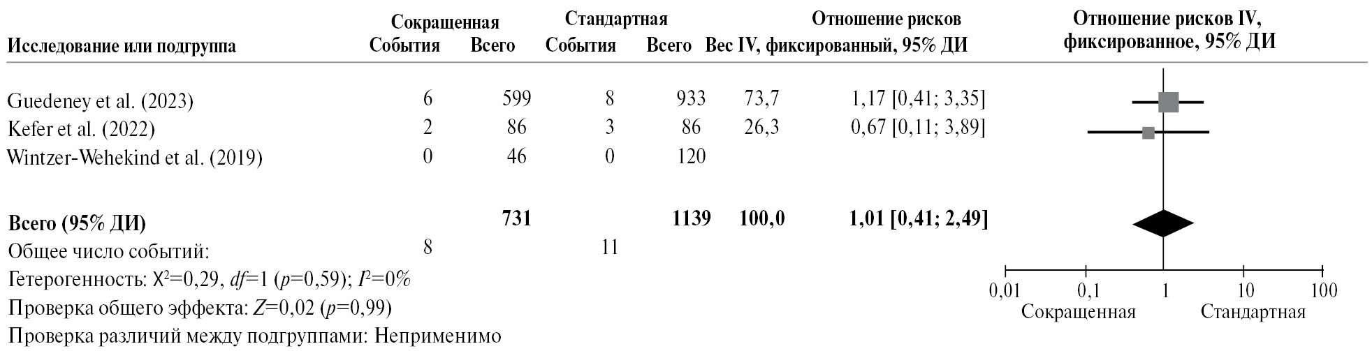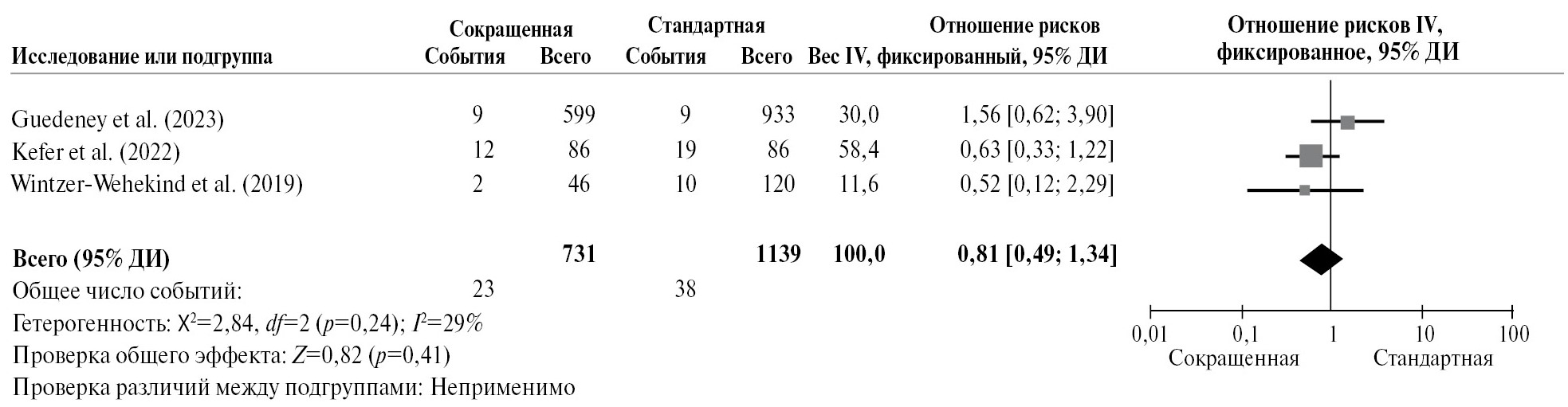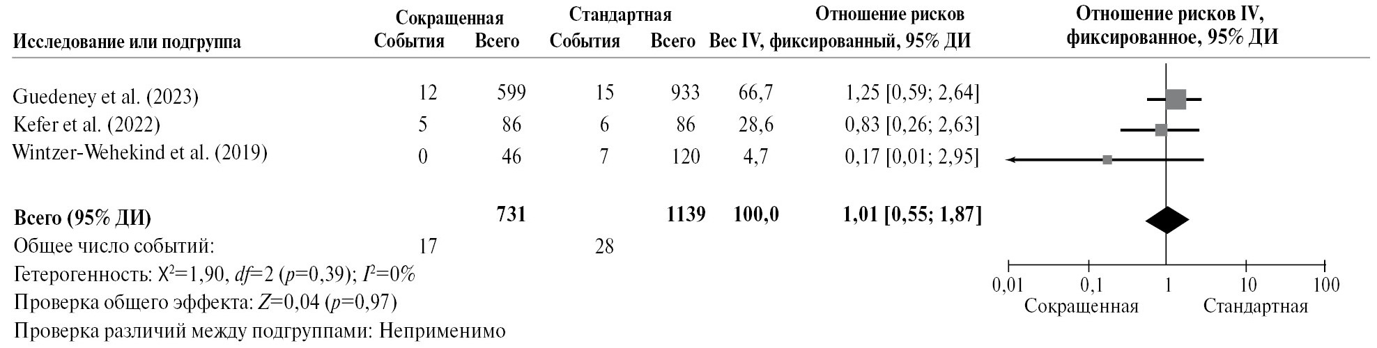 Результаты метаанализа по влиянию схем ААТ на частоту ИИ представлены на рис. 10. Суммарно зафиксировано 19 случаев – 8 эпизодов ИИ в группах с сокращенной длительностью ААТ и 11 в группах с длительной терапией. Общий ОР для всех исследований составил 1,01 (95% ДИ 0,41–2,49), что свидетельствует об отсутствии значимых различий в рисках наступления ИИ у пациентов, получавших различные схемы.