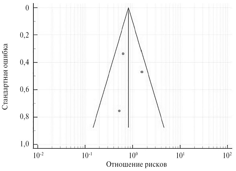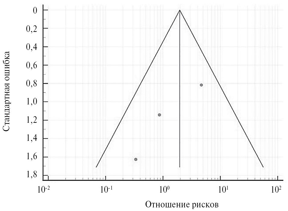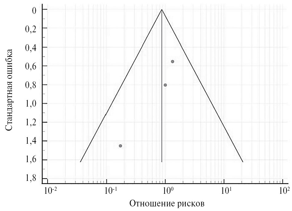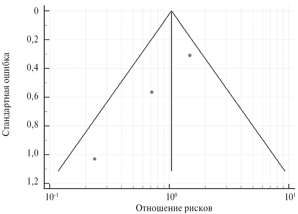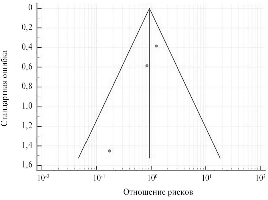 Гетерогенность между исследованиями низкая (Chi²=1,79, df=2, p=0,41; I²=0%), что указывает на отсутствие значительной вариабельности результатов между ними. Статистическая значимость общего эффекта не достигнута (Z=0,04, p=0,97). Симметричная форма воронкообразного графика указывает на отсутствие значительных публикационных смещений, что подтверждает надежность полученных результатов (рис. 9).