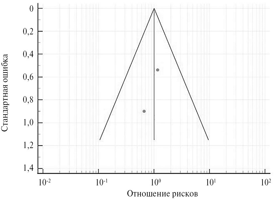 Гетерогенность между исследованиями низкая (Chi²=0,29, df=1, p=0,59; I²=0%), что указывает на отсутствие значительной вариабельности результатов между ними. Статистическая значимость общего эффекта не достигнута (Z=0,02, p=0,99). Симметричная форма воронкообразного графика указывает на отсутствие значительных публикационных смещений, что подтверждает надежность полученных результатов (рис. 11).