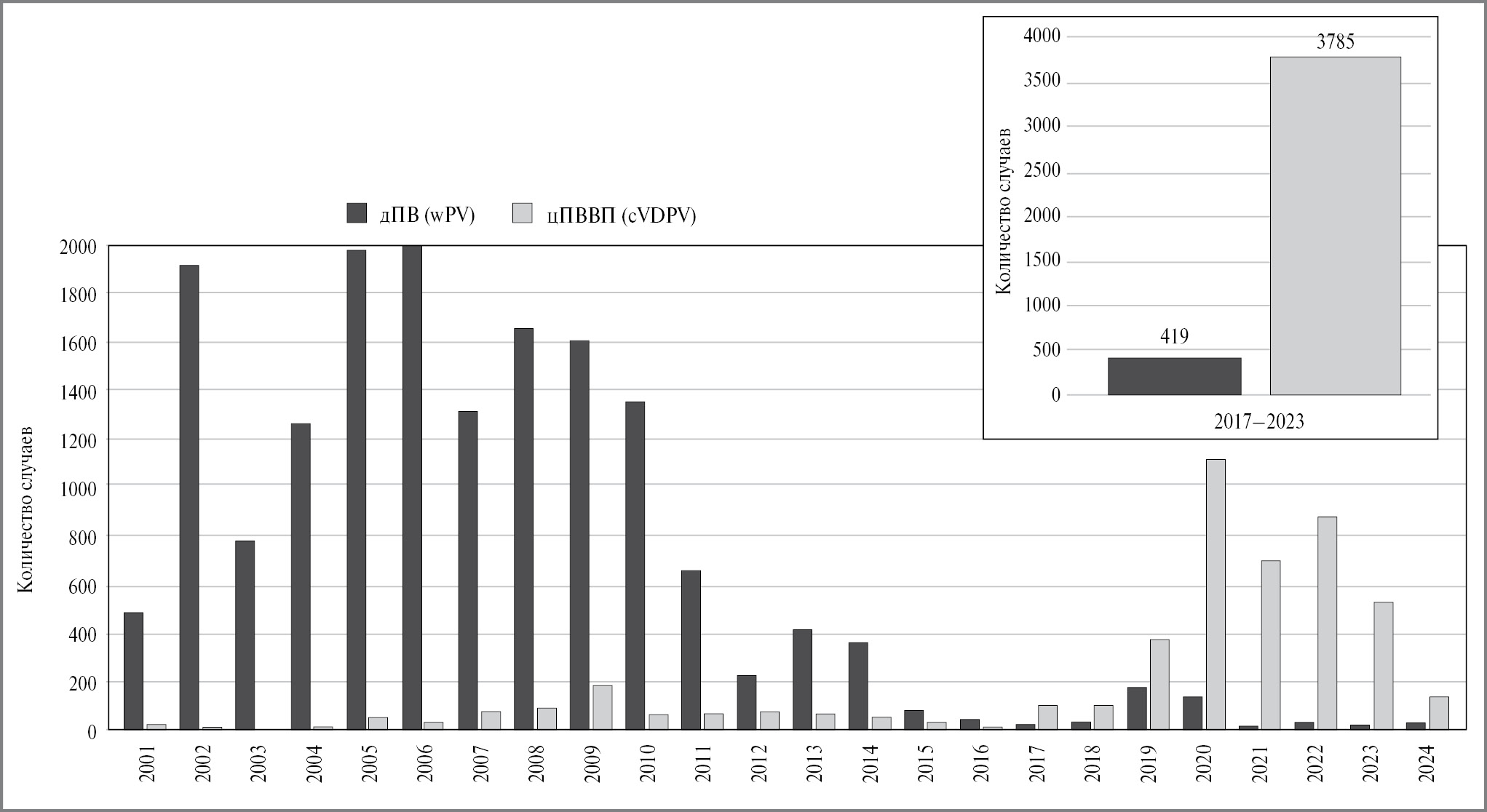Таким образом, ОПВ из штаммов Сэбина, без которой успех борьбы с ПМ стал бы невозможен, почти через 50 лет от начала применения явилась причиной возникновения заболевания. Возможность и последствия реверсии штаммов Сэбина неоднократно обсуждались [20, 21], но значение этого свойства проявилось на фоне снижения заболеваемости, вызванной дПВ, к началу 2000-х годов. Методы быстрого изучения генома ПВ, разработанные к этому времени, позволили установить, что еще в 1963–1966 г. в Беларуси [22] и в 1968 г. в Польше существовали циркуляция и случаи заболевания, связанные с ПВВП [23]. С 2017 г. количество случаев ПМ, вызванного цПВВП, стало превосходить количество случаев, вызванных дПВ (рис. 1).