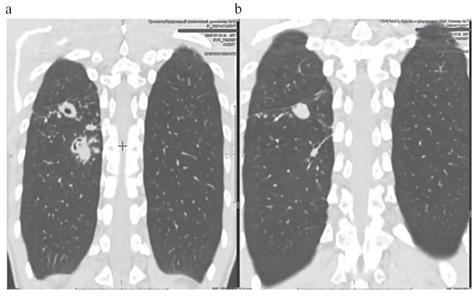 Fig. 1. Computed tomography of the chest organs of patient L. before (a) and after (b) anti-tuberculosis therapy.
