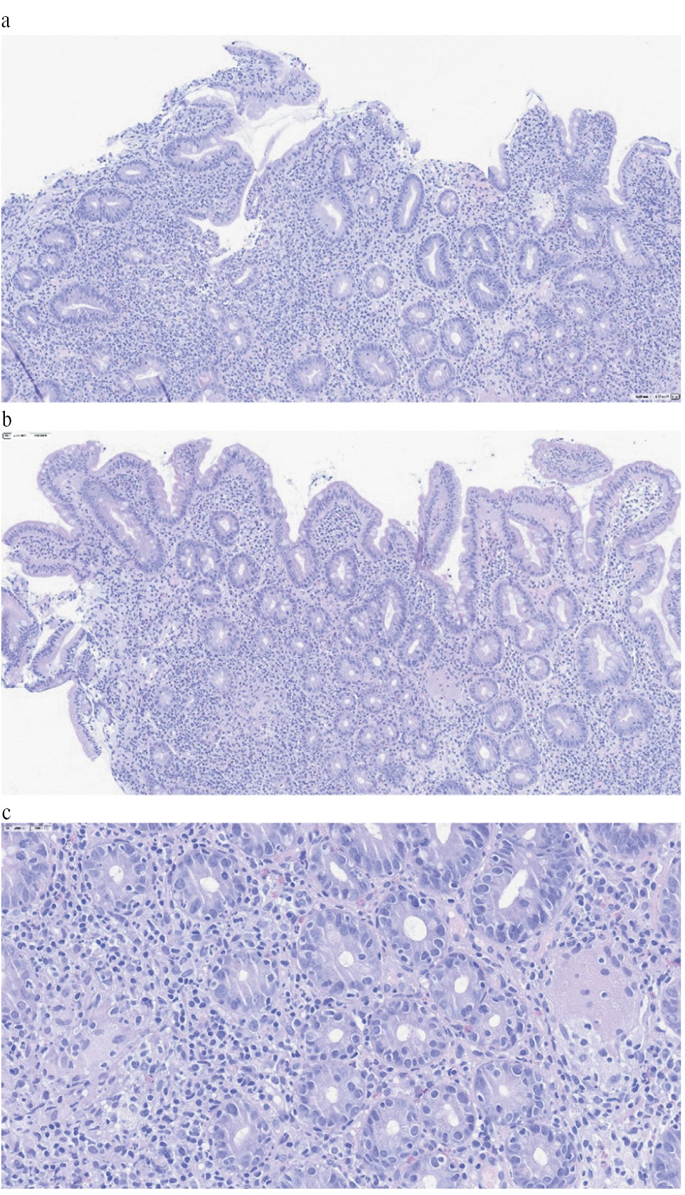 3. Fig. 2. Crohn's disease of the duodenum: a – destruction of intestinal villi and crypts with the formation of deep slit erosion; b – areas of granulomatous inflammation in the proper plate of the mucous membrane of the duodenum; c – giant multinucleated cells in areas of granulomatous inflammation. Stained with hematoxylin and eosin. Magnification: a, b – ×120; c – ×500.