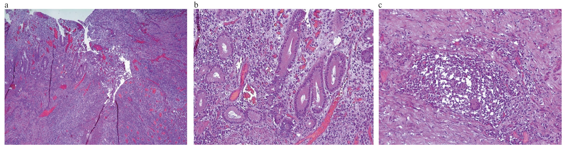 Fig. 6. Chronic terminal ileitis of Crohn's disease: a – destruction of intestinal villi and crypts with the formation of a slit ulcer in the mucous membrane of the ileum; b – areas of pyloric metaplasia at the edges of the ulcerative defect; c – epithelioid cell granuloma with giant multinucleated cells in the thickness of the muscle layer. Stained with hematoxylin and eosin. Magnification: a – ×90; b, c – ×300.