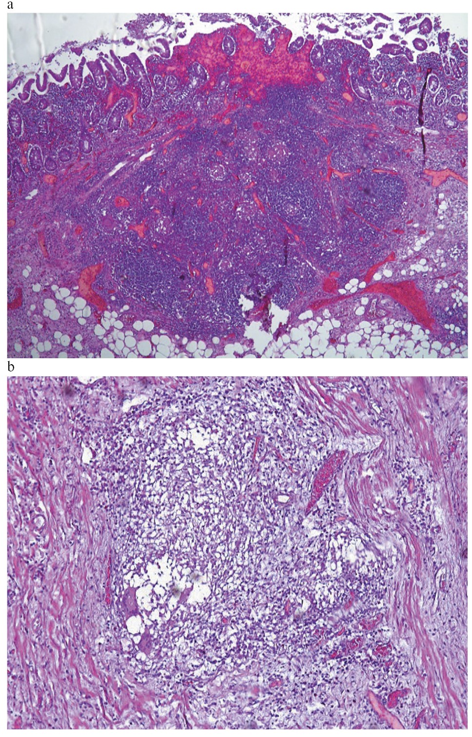 8. Fig. 7. Specific granulomatous inflammation in tuberculosis of the colon: a – hyperplasia of lymphoid tissue with multiple epithelioid cell granulomas; b – epithelioid cell granulomas with areas of caseous necrosis. Stained with hematoxylin and eosin. Magnification: a – ×90, b – ×300.