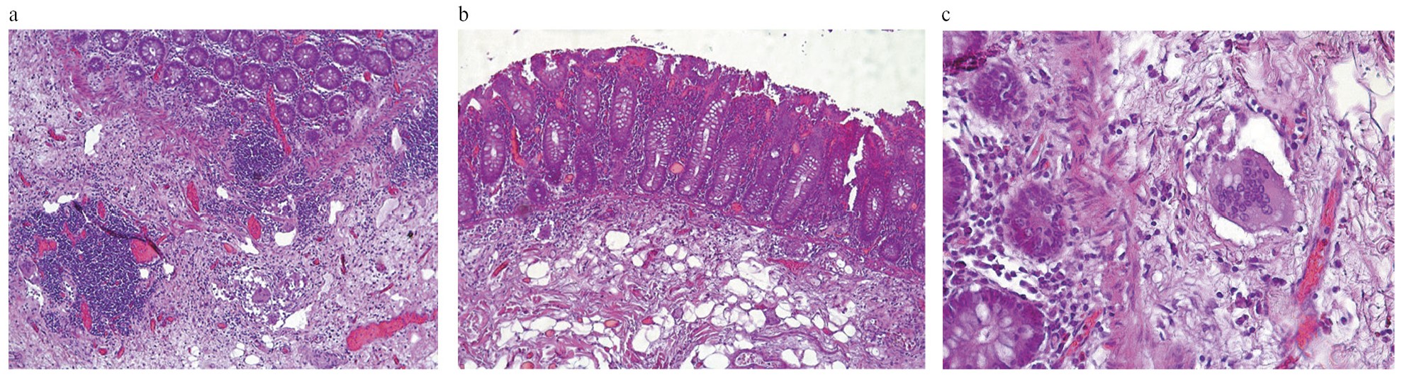 9. Fig. 8. Transmural granulomatous inflammation in the colon wall in generalized tuberculosis: a – multiple epithelioid cell granulomas in the mucous membrane and submucosal layer; b – lipomatosis and fibrosis of the submucosal layer; c – giant multinucleated cells lying freely among fibrous structures. Stained with hematoxylin and eosin. Magnification: a, b – ×90; c – ×300.