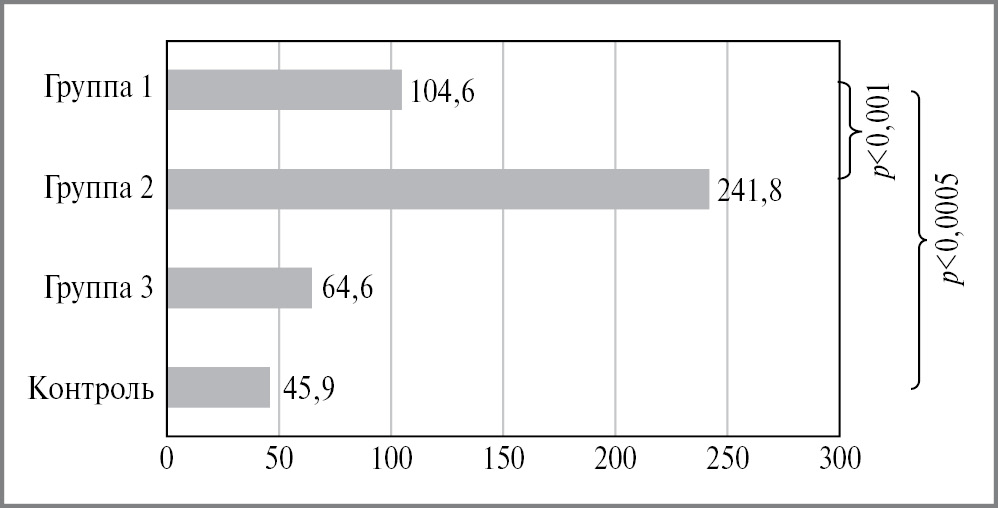 Рис. 1. Сравнительные данные по оценке общего числа рефлюксов в исследуемых группах.