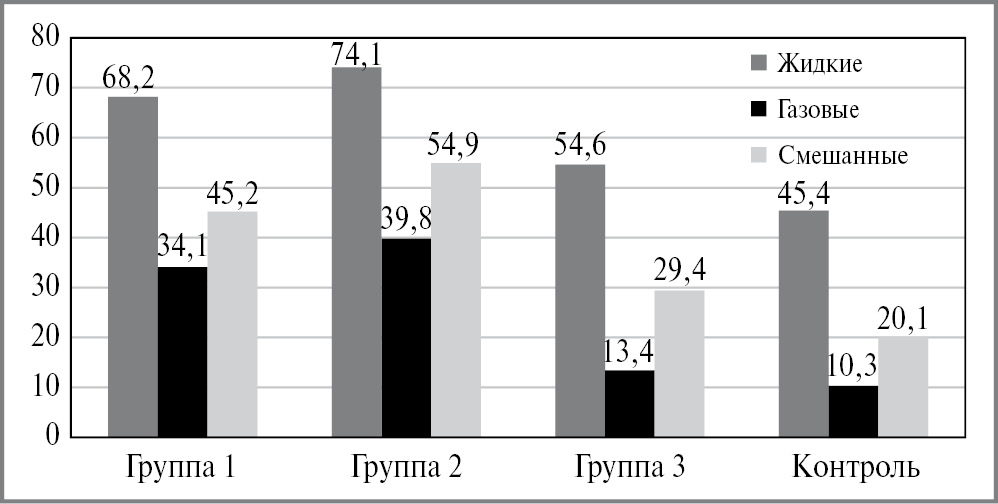 Данные о характере рефлюктата у обследованных пациентов, представленные на рис. 2, свидетельствуют, что во всех группах преобладали жидкие рефлюксы, реже выявлялись смешанные, а реже всего – газовые ГЭР.