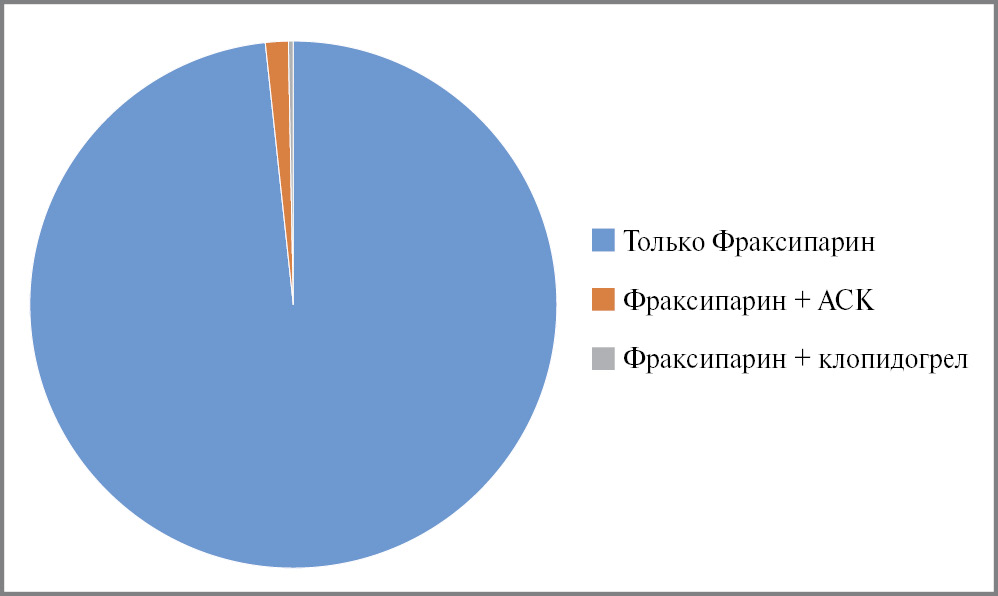 В периоперационном периоде 769 (98,3%) пациентов в качестве антитромботической профилактики получали монотерапию Фраксипарином, а 13 (1,7%) человек в связи с выполненным ранее чрескожным коронарным вмешательством или высоким кардиологическим риском получали Фраксипарин в комбинации с антиагрегантом (рис. 1).
