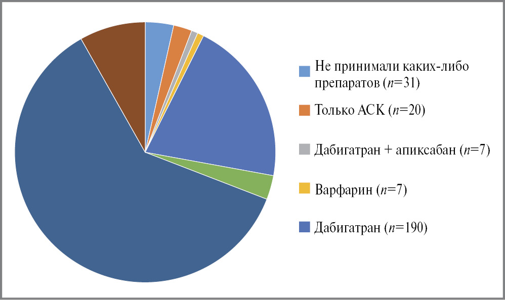Для пациентов, принимавших до операции антитромбоцитарные средства, вопрос о продолжении или временной отмене этих препаратов в период назначения антикоагулянта решали индивидуально на основании исходного наличия показаний к антиагрегантной терапии, величины сердечно-сосудистого риска по шкале SCORE, риска кровотечений и сопутствующих состояний. Всем пациентам, которые исходно принимали антиагрегант без каких-либо показаний, даны рекомендации прекратить прием данного препарата.