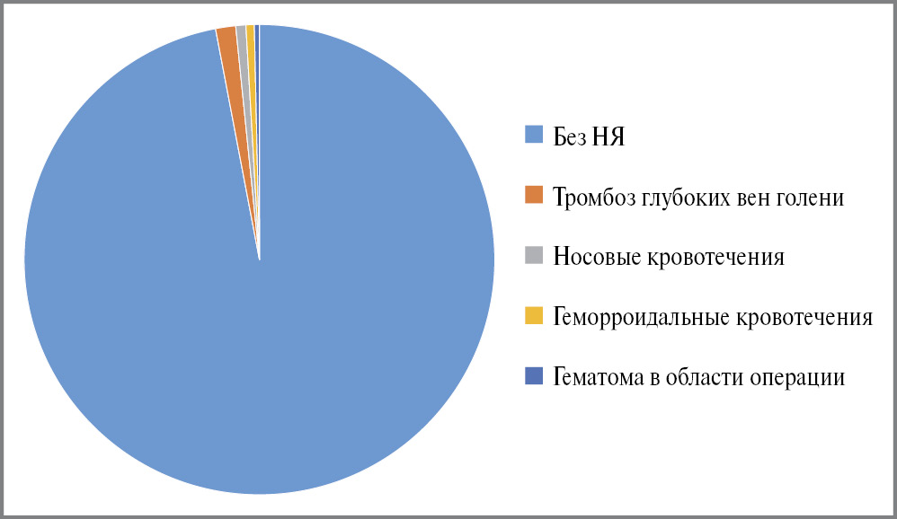 В течение первого месяца после операции зарегистрировано 9 (1,2%) случаев тромбозов глубоких вен голени. При расспросе обнаружено, что 5 из 9 пациентов не принимали какие-либо антикоагулянты, еще 4 участника не соблюдали режим реабилитации. У 5 (0,6%) пациентов зарегистрированы носовые кровотечения (3 в группе дабигатрана и 2 в группе ривароксабана), у 4 (0,5%) – геморроидальные кровотечения (2 в группе дабигатрана и 2 в группе ривароксабана), у 2 (0,2%) – гематомы в области операции, причем оба больных до операции получали варфарин (рис. 3). Все случаи тромбозов и кровотечений были легкой степени тяжести и разрешились самостоятельно. Одна пациентка сообщила о появлении болей в животе на фоне приема дабигатрана, которые прошли после прекращения приема препарата и повторно возникли при попытке возобновления терапии. Данное НЯ описано в инструкции к этому препарату. Статистически значимых различий в частоте НЯ между различными схемами антикоагулянтной терапии не обнаружено, как и не зарегистрировано увеличения частоты кровотечений при приеме антикоагулянтов вместе с антиагрегантами. Не обнаружено статистически значимой зависимости частоты тромбозов и кровотечений в зависимости от вида проведенной операции (ТЭКС или ТЭТС). Все случаи кровотечения зарегистрированы у пациентов, принимавших один антикоагулянт.