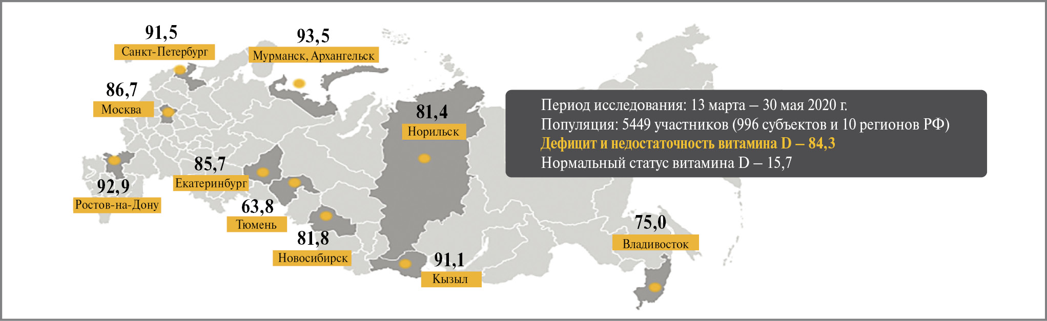 Fig. 1. Prevalence of vitamin D insufficiency/deficiency in various regions of the Russian Federation, % [28].