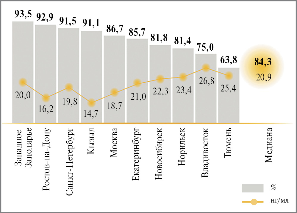 Распространенность дефицита витамина D не зависела от экономических условий (например, в Чебоксарах и Москве встречаемость дефицита одинакова – 96%). Определенная взаимосвязь прослеживалась для времени года, однако даже в самые благополучные периоды частота дефицита витамина D оставалась высокой, в том числе у молодых людей [28] (рис. 2).