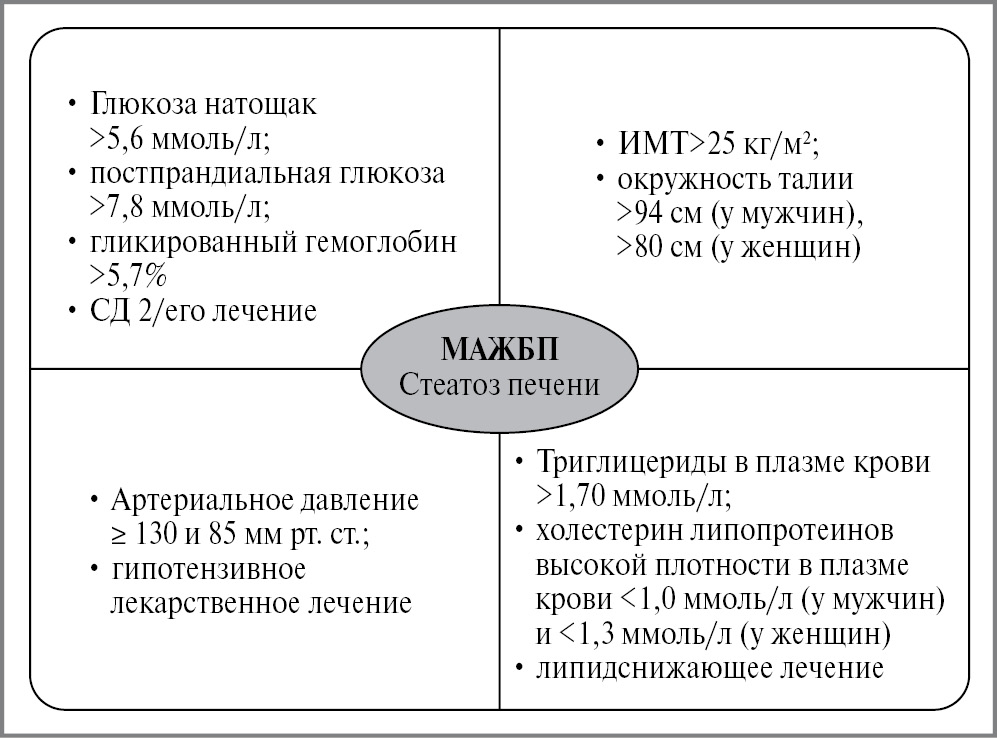 Диагноз МАЖБП установлен на основании наличия стеатоза печени в сочетании с одним (или более) фактором кардиометаболического риска (см. рис. 1) [1].